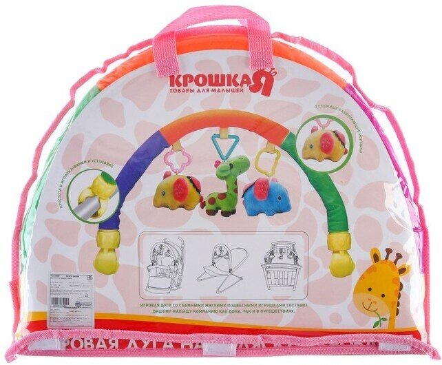 Эту дугу можно закрепить на детской кроватке, коляске или автокресле с помощью удобных прищепок. Угол наклона дуги регулируется. Сначала малыш будет просто рассматривать яркие игрушки, лежа на спинке, но со временем он обязательно начнет тянуться к ним ручками и ножками, совершенствуя свои двигательные навыки. Игрушки на дуге имеют различные цвета и формы, в том числе материал — специально для развития тактильных ощущений малышей. Изделие изготовлено из текстильных материалов с элементами пластмассы.