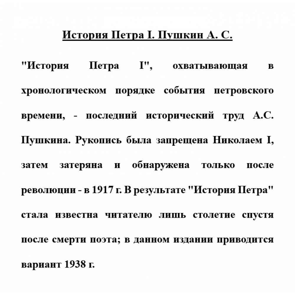 "История Петра I", охватывающая в хронологическом порядке события петровского времени, - последний исторический труд А.С. Пушкина. Рукопись была запрещена Николаем I, затем затеряна и обнаружена только после революции - в 1917 г. В результате, "История Петра" стала известна читателю лишь столетие спустя после смерти поэта; в данном издании приводится вариант 1938 г.