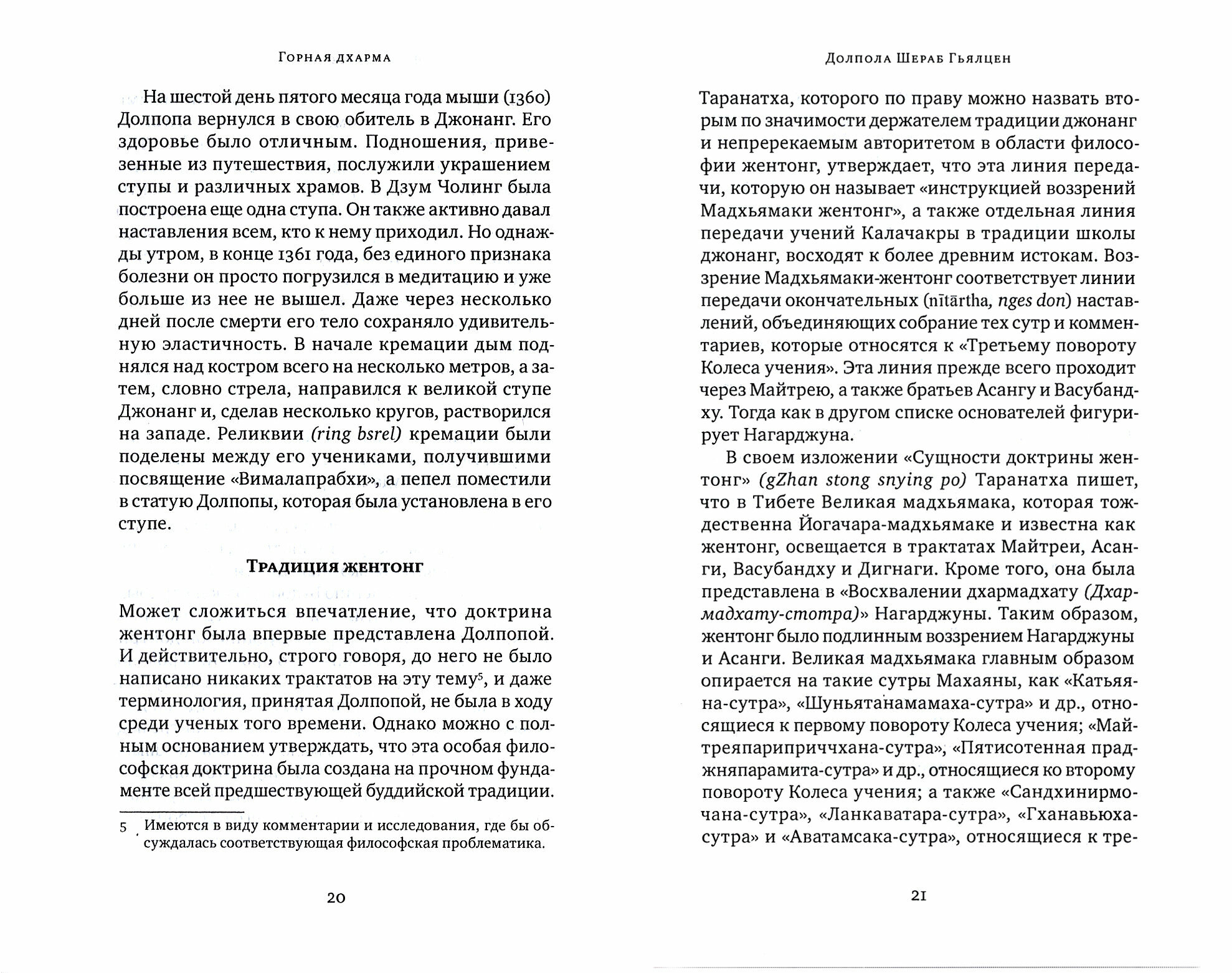 Долпола Шераб Гьялцен (1292-1361), один из величайших учителей Дхармы средневекового Тибета, воплощение царя Шамбалы и десятый держатель линии передачи Калачакры, свой трактат "Горная Дхарма" посвятил изложению и обоснованию основных положений учения мадхьямака-жентонг. В нем автор стремится показать, что разрабатываемое им учение имеет глубокие корни в предшествующей буддийской традиции, и с этой целью он приводит множество цитат из самых различных текстовых источников.