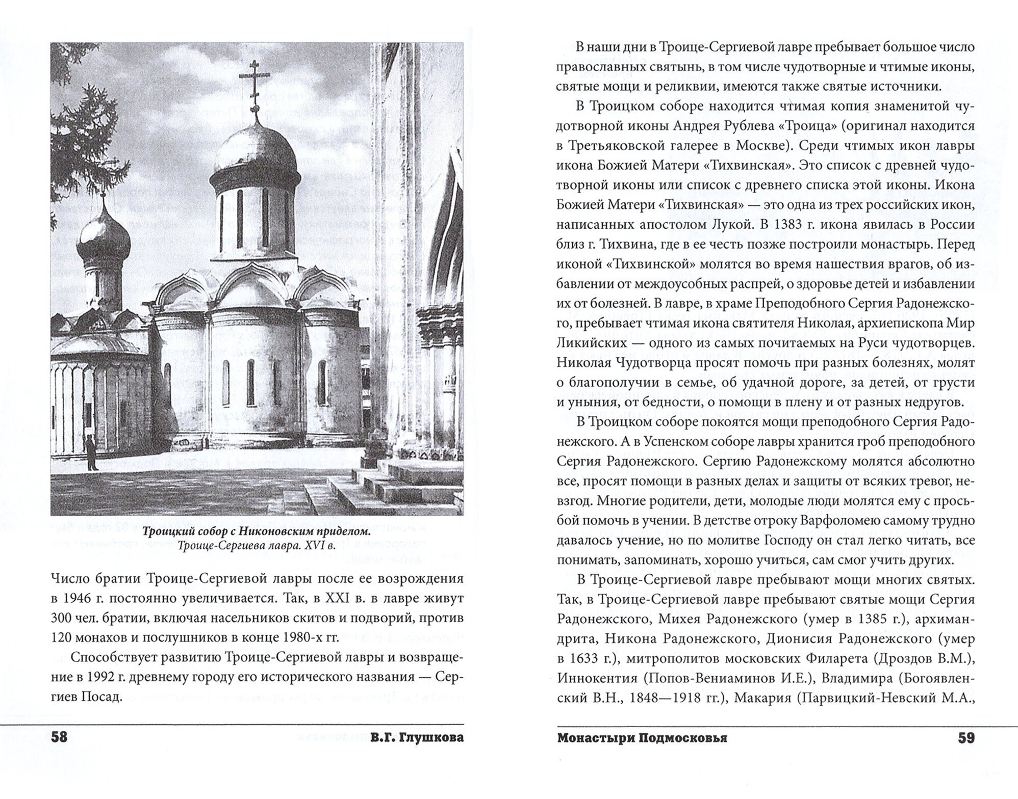 В книге В.Г. Глушковой "Монастыри Подмосковья" собран исторический, краеведческий и архитектурно-художественный материал о двадцати шести основных действующих монастырях Подмосковья.
