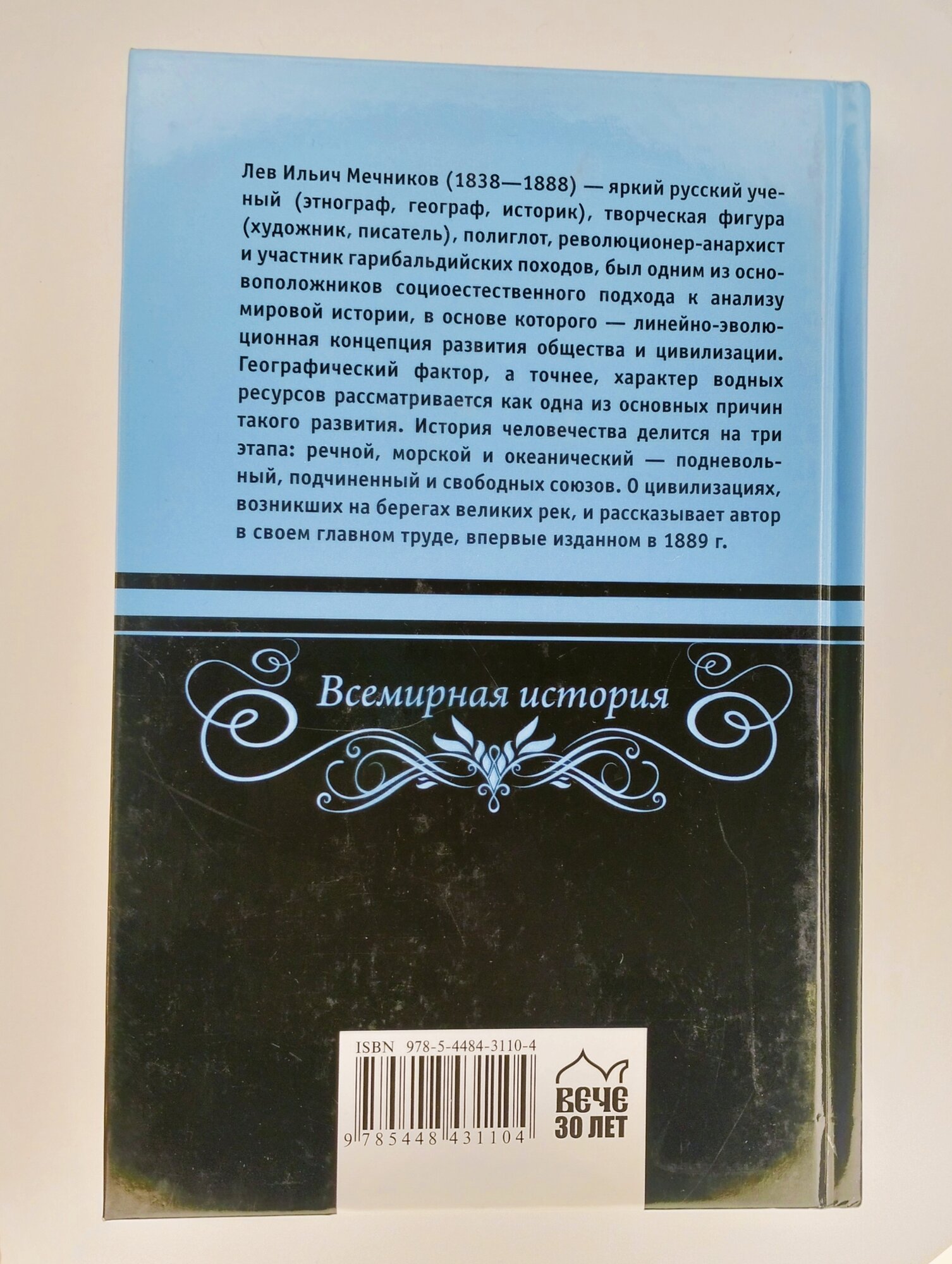 Лев Ильич Мечников (1838-1888) - яркий русский ученый (этнограф, географ, историк), творческая фигура (художник, писатель), полиглот, революционер-анархист и участник гарибальдийских походов, был одним из основоположников социоестественного подхода к анализу мировой истории, в основе которого - линейно-эволюционная концепция развития общества и цивилизации. Географический фактор, а точнее, характер водных ресурсов рассматривается как одна из основных причин такого развития. История человечества делится на три этапа: речной, морской и океанический - подневольный, подчиненный и свободных союзов. О цивилизациях, возникших на берегах великих рек, и рассказывает автор в своем главном труде, впервые изданном в 1889 г.