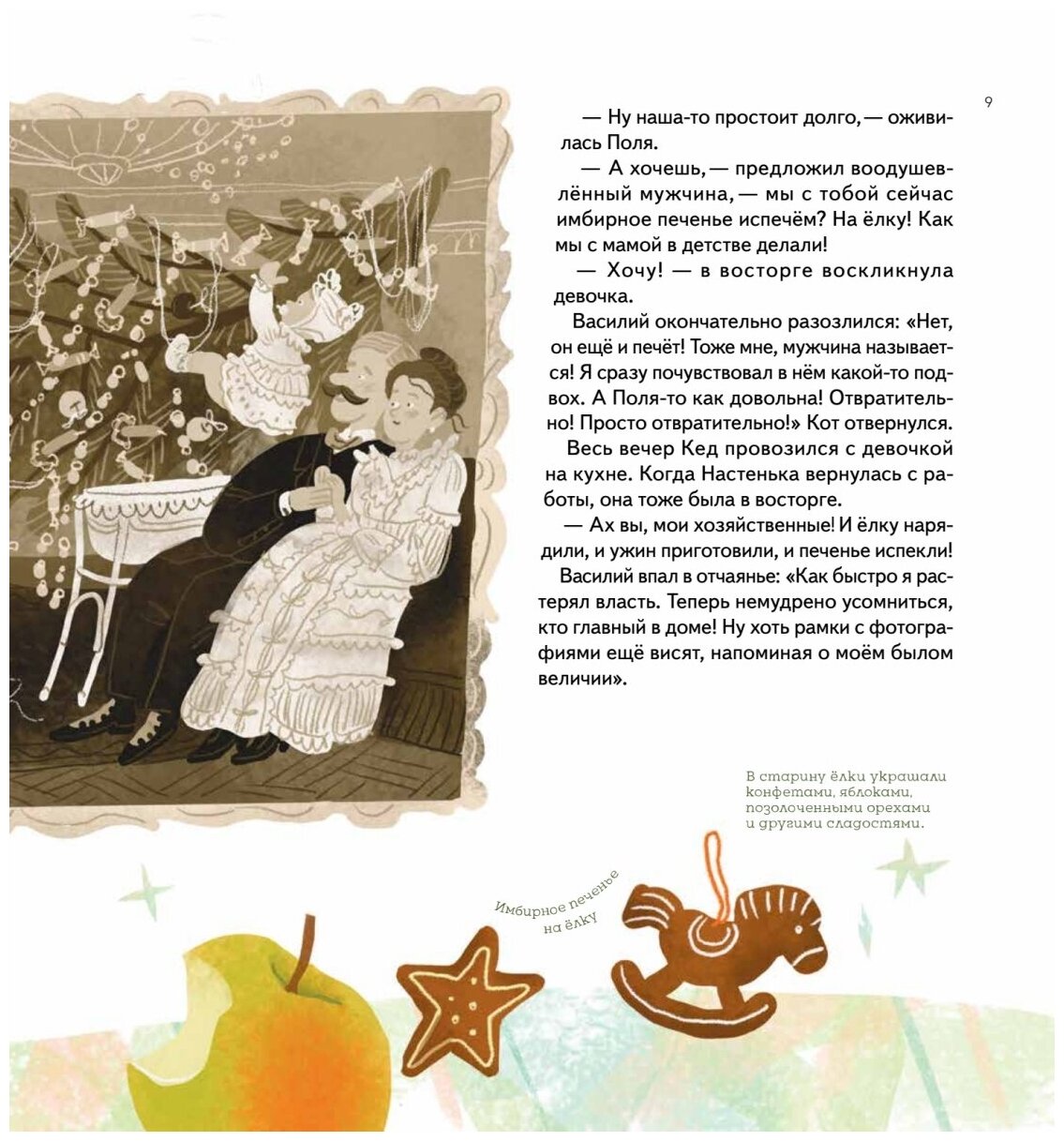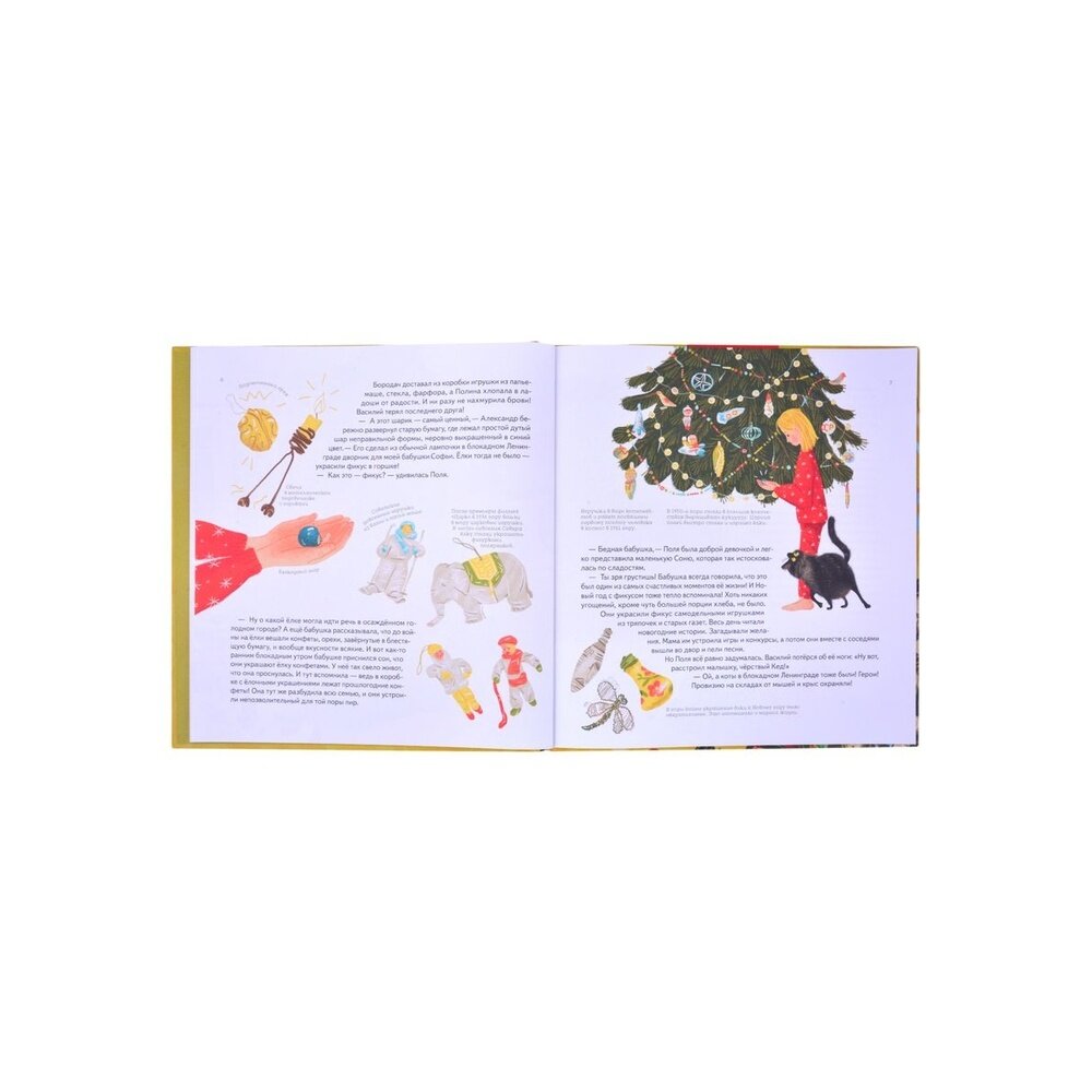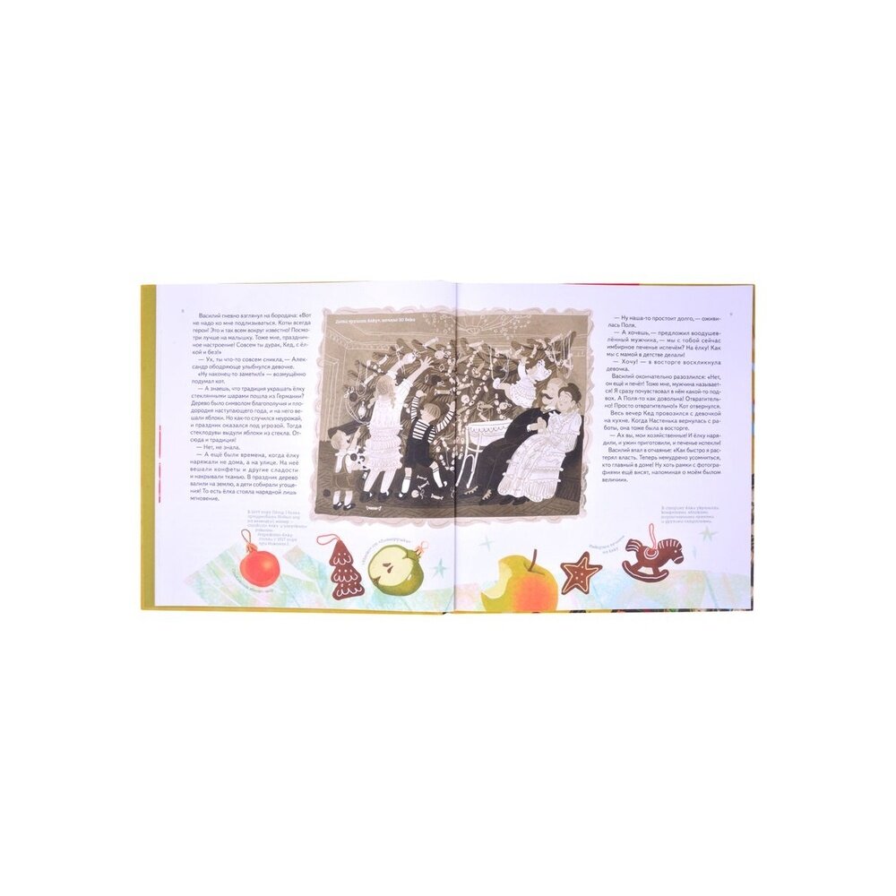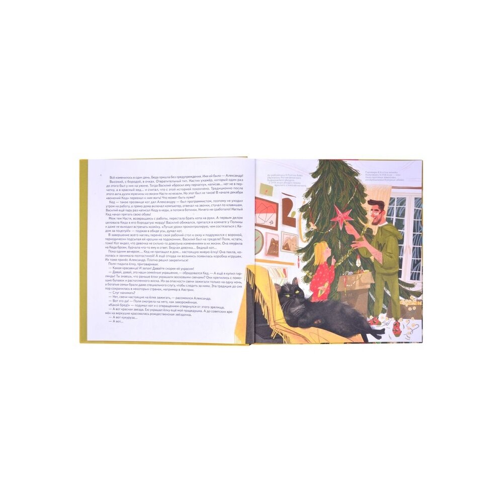 Прекрасная небольшая новогодняя история из жизни одной семьи. Сейчас выходит уже больше и больше новогодних детских книжек, которым удается уже в ноябре зарядить читателя теплым новогодним настроением. Рассказ ведется со стороны кота.. как это ни странно. Автор превосходно передал темперамент домашнего питомца: уверенного в себе хозяина дома, жадного на любовь и ласку, ведь уже долгое время всего этого ему доставалось в большом количестве, от двух прекрасных дам: матери и дочки. Но с тех пор, как новый ухажер мамы поселился у них дома, пульт управления забрали из кошачих лап. С тех пор в доме у всех какая-то неразбериха. Не буду рассказывать все, потому что история действительно светлая и добрая, а главное незамысловатая, про обычную жизнь. Про жизнь с неудачами, с какой-либо неприязнью, которая возникает от боязни стать нелюбимым, ведь каждый и человек и животное нуждается в любви и ласке. В истории рассказывается про случай из блокадного Ленинграда, который пришелся бабушке одного из главных героев. Эта история была дана не просто так. В конце раскрывается очень важная мысль о том, что следует ценить то, что имеешь, и всегда искать только позитивные моменты, поскольку даже в столь тяжелое военное время люди находили в себе силы улыбаться, ценить и любить.