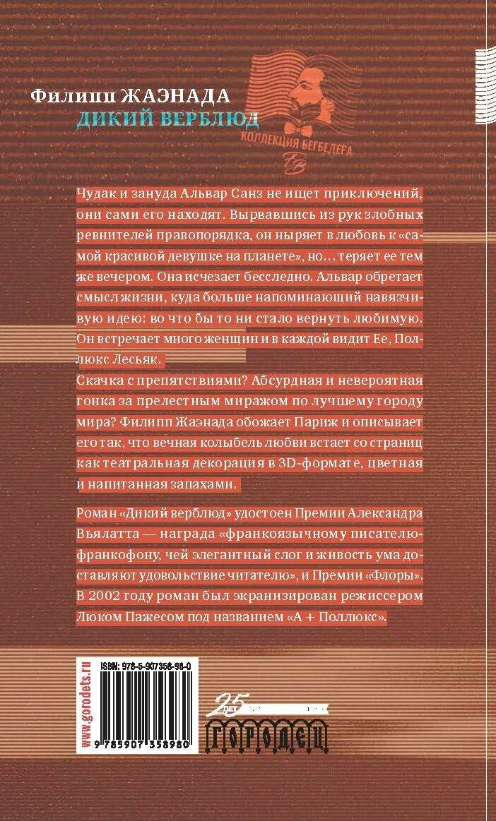 На сегодняшний день товар «Книга: Дикий верблюд (Жаэнада Филипп); Городец, 2021» можно купить с кешбеком в 4 магазинах: book24, Буквоед, Читай-город, Яндекс.Маркет