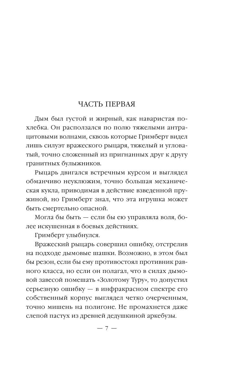 Лично у меня не пошло. Бросила через 50 страниц. Возможно, тем, кто занимается робототехникой, или любителям боевой фантастики будет интересно, а мне за первые 50 страниц не дали ни обаятельного героя, ни сюжетной зацепки, только описания боев роботов-рыцарей с живым управляющим посреди гигантских лат и что-то про военный проблемы короля чего-то средневекового. Скучно было. Написано нормально.