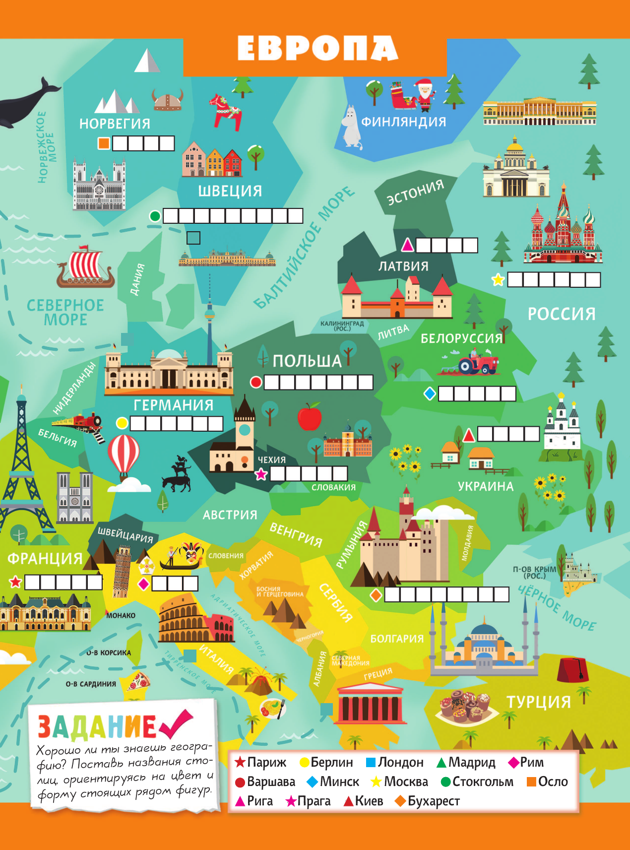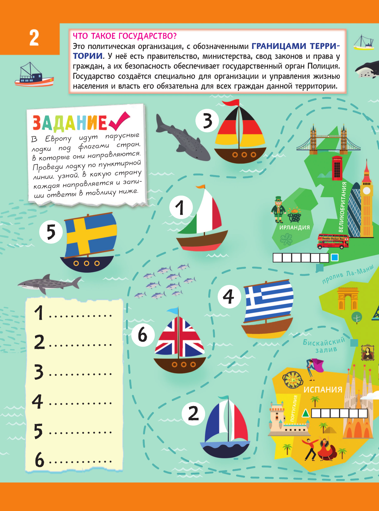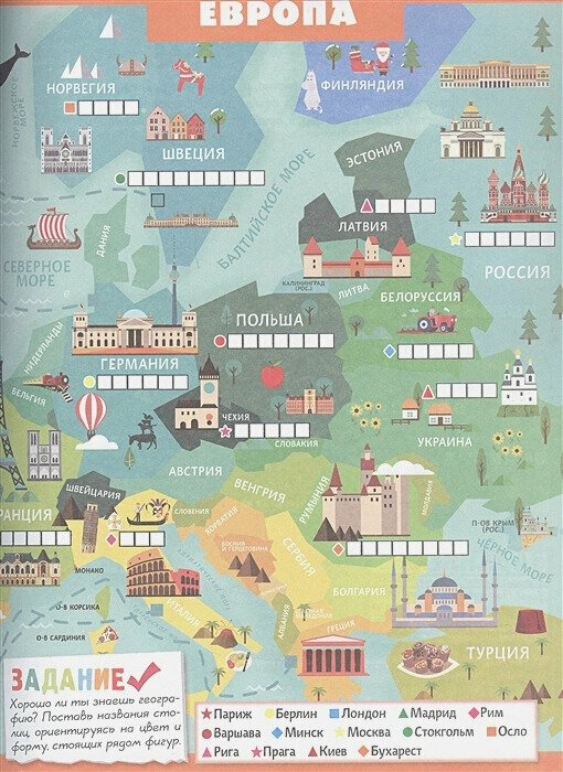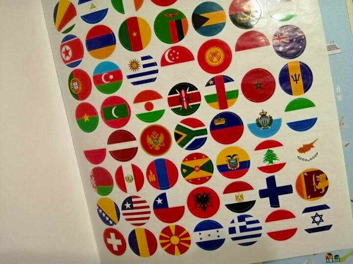 Книга красочная, есть наклейки (это всегда интересно), можно повторить столицы стран, флаги, НО мы с сыном нашли несколько недочётов: 1. На второй странице корабль под номером пять плывет в Швецию, а флаг изображен Финляндии (мы сами перекрасили флаг) 2. На развороте вместо наклейки страны Алжир, наклейка страны Абхазия.