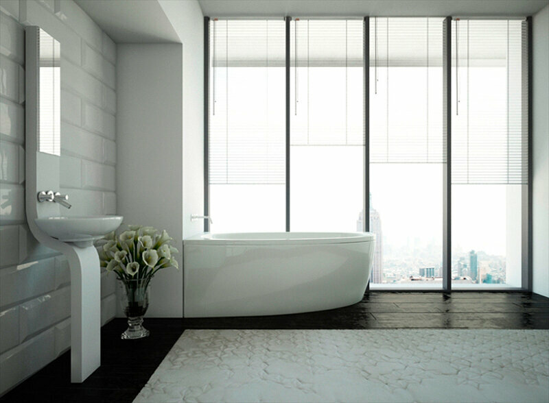 Белоснежная ванна с простым и лаконичным дизайном дополнит большинство ванных комнат в современном стиле.