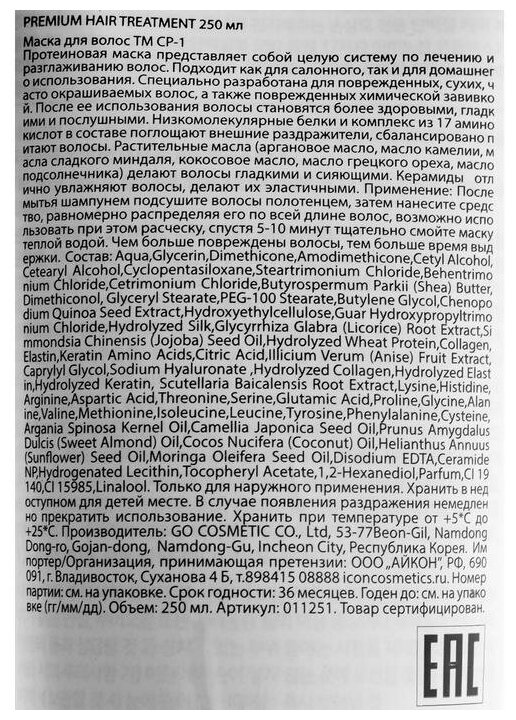 | Активные компоненты | комплекс из 17 аминокислот, масло жожоба, масло ши, масло арганы, масло камелии, масло сладкого миндаля, масло кокоса, масло грецкого ореха, масло подсолнечника, керамиды, гидролизат шелка, коллаген, растительные протеины |