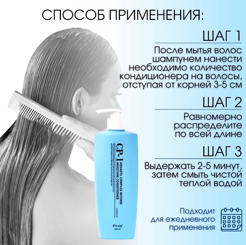 Способ применения: После мытья волос шампунем нанести необходимое количество кондиционера на волосы, равномерно распределить по всей длине от корней до кончиков. Выдержать 2-5 минут, затем смыть чистой теплой водой. Подходит для ежедневного применения.