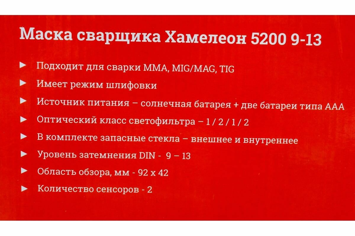 Маска сварщика Gigant Хамелеон 9-13 5200 G-110504 применяется для защиты лица и глаз от расплавленного металла и искр, а также от вредного воздействия инфракрасного и ультрафиолетового излучения во время проведения сварочных работ.Корпус сварочной маски имеет удобную обтекаемую форму, что обеспечивает постоянную защиту и комфорт всем областям головы и шеи.Светофильтр системы Хамелеон обеспечивает автоматическое затемнение при зажигании сварочной дуги.Модель имеет переключатель «режим шлифовка», что дает возможность использовать её в качестве защитного щитка при шлифовальных работах.Gigant – собственная торговая марка компании ВсеИнструменты. ру, разработанная специально для требовательных мастеров. Продукция представлена профессиональными и бытовыми инструментами, имеет доступную цену и высокое качество. При изготовлении товаров Gigant используется современное оборудование и прочные материалы. Производство осуществляется на современных предприятиях России и Азии. Тестирование товаров осуществляется в два этапа, каждая партия инструментов проходит проверку на соответствие стандартам и заявленным техническим характеристикам. Это является залогом качества и надежности готового продукта. Продукция представлена широкой линейкой инструментов. У нас можно приобрести ручной инструмент, строительный, садовый, сантехнический, климатический, крепежный, автогаражный, а также станки, расходные материалы и многое другое.