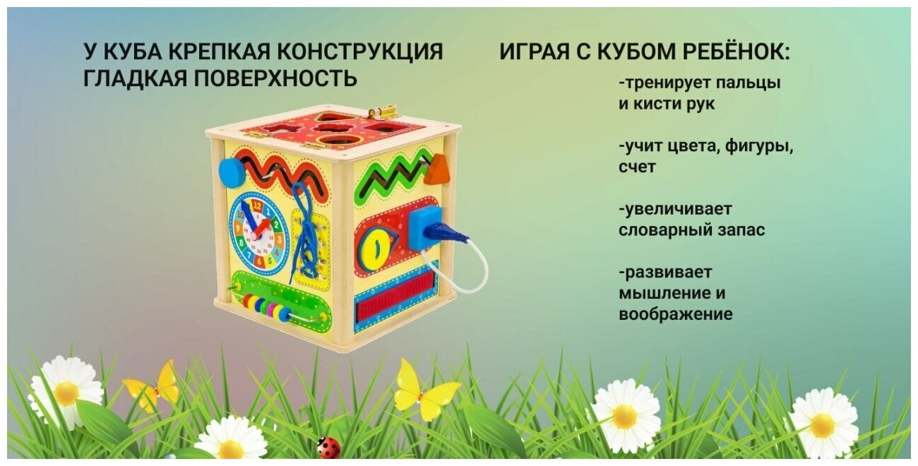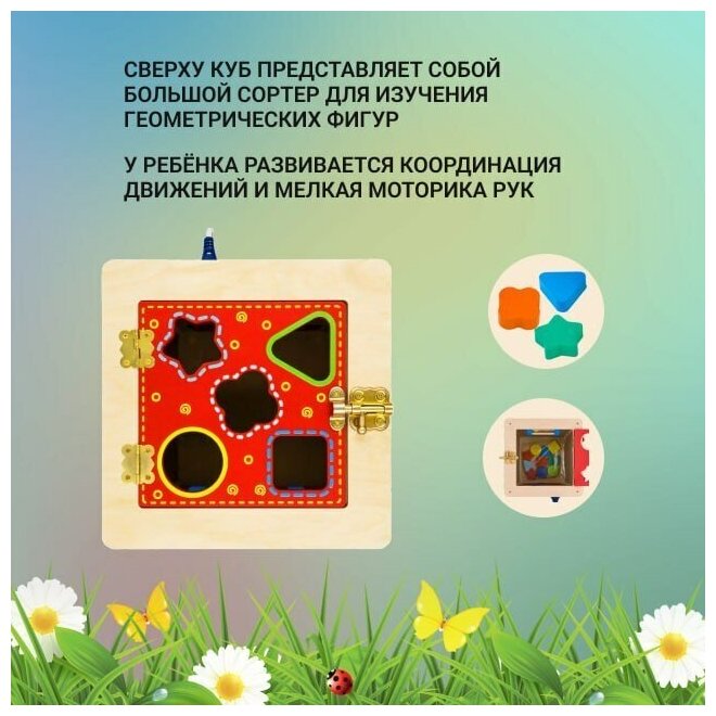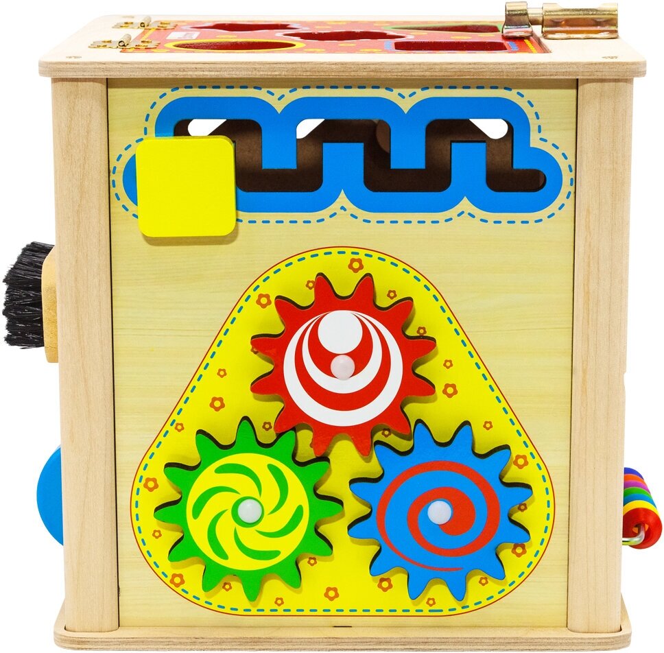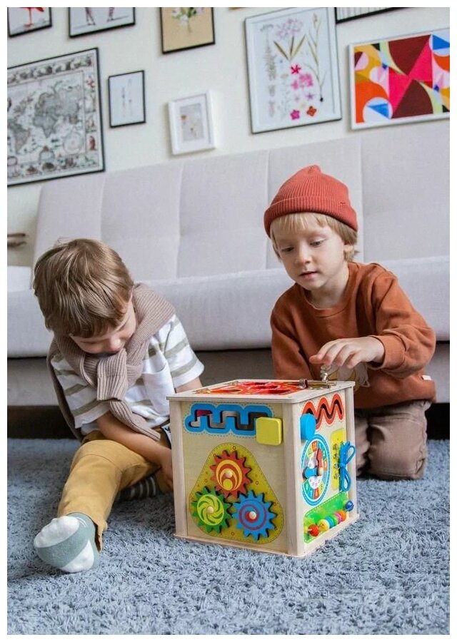 Универсальный куб – это комплекс из игровых досок, созданный по методике Монтессори, для развития основных навыков ребёнка: мелкой моторики, воображения, логики и речи. Универсальный куб состоит из 5 модульных досок, на каждой из которых закреплены функциональные детали: шестерёнки, розетка с вилкой, барабан, змейка, часики, молния и т.д. Такая игрушка поможет выучить цвета и предметы окружающего мира в игровой форме, разобраться с фигурами и формами, научиться шнуровать, развивая логику, внимание, мелкую моторику.