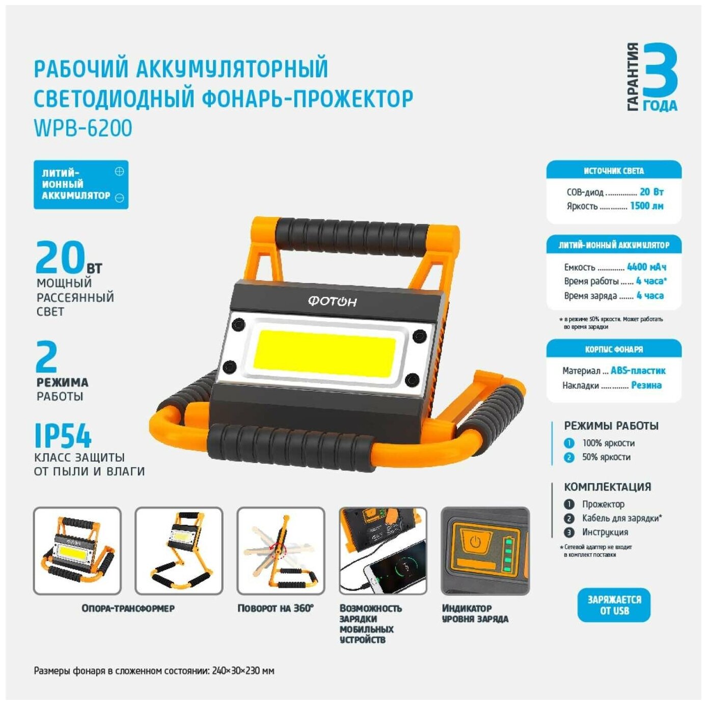 **Фонарь-прожектор Фотон WPВ-6200** предназначен для эксплуатации внутри и снаружи помещений. Позволяет подсвечивать нужную зону, фасады зданий. Изготовлен из прочного пластика черного цвета. Оснащен удобной подставкой, позволяющей установить устройство на ровной поверхности. Работает от электрической сети и литий-ионной батареи. Тип ламп — встроенные светодиоды LED COB.