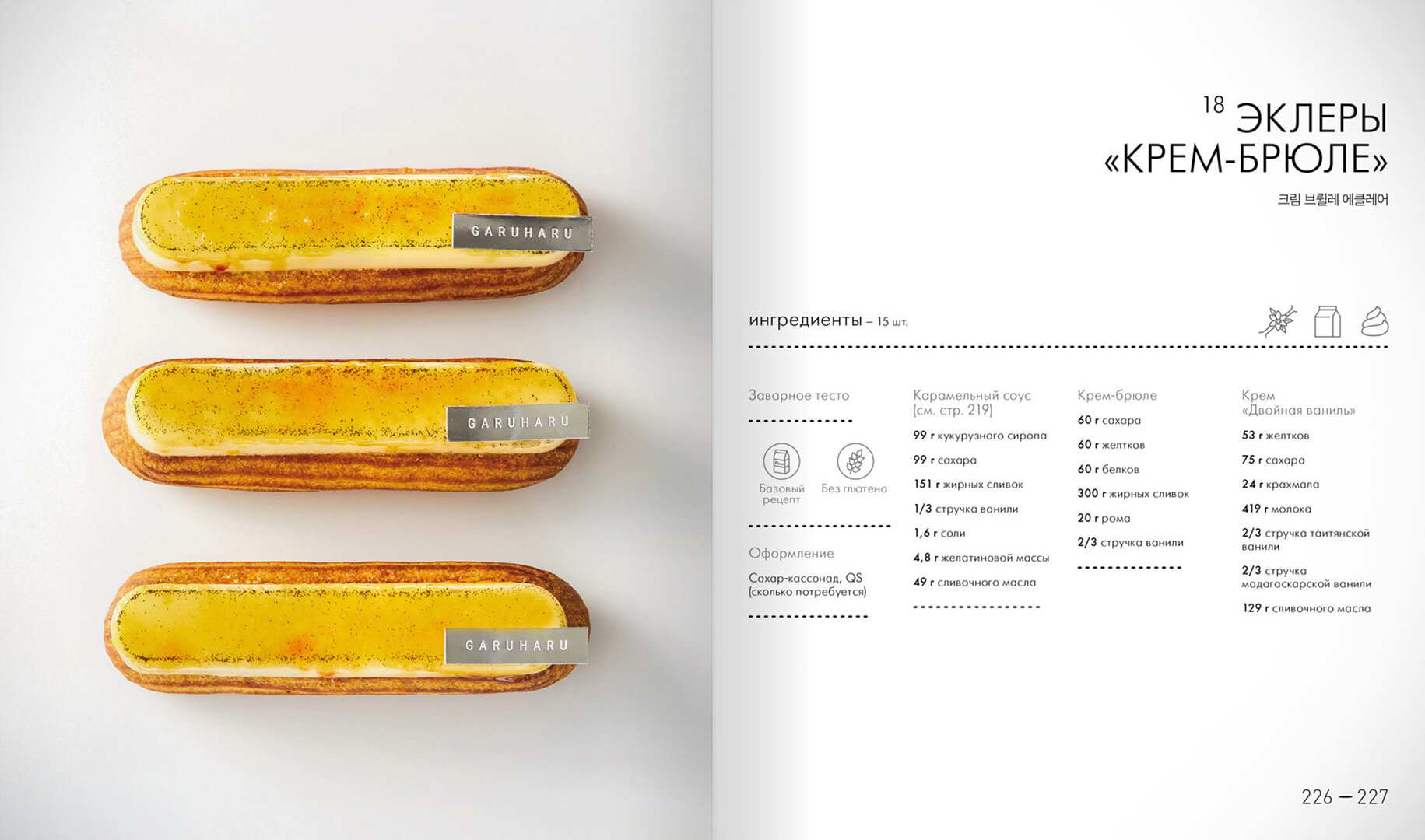 Из этой книги вы узнаете все о приготовлении эклеров, кондитерского изделия, которое, стараниями лучших шеф-кондитеров мира, стало настоящим трендом. Во введении рассказывается об особенностях рецептур обычного и безглютенового заварного теста, тонкостях выпекания в подовой и конвекционной печи, начинке, глазировании и работе с шоколадом. В основной части собраны подробнейшие пошаговые рецепты 20 стильных и аппетитных эклеров от шеф-кондитера Garuharu Юн Ынён, с самыми разными начинками и декором, например, с соленой карамелью, с черным кунжутом или с фисташкой, а также такие классические вкусы, как "Монблан", "Тирамису" и "Мохито"... И приятное дополнение в конце: шу с легким заварным кремом и шукеты.