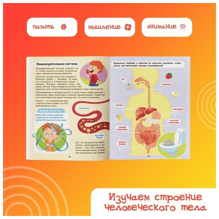Что происходит с нашей едой внутри нас? Зачем нужна печень? Скорее открывай эту книжку, выполняй весёлые задания с наклейками и узнавай, как устроено тело человека!