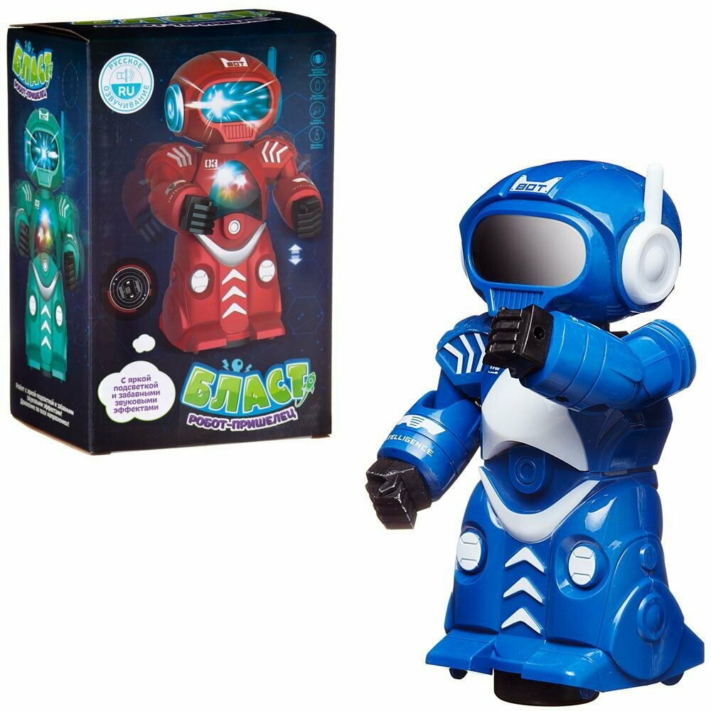 Робот-пришелец из серии Бласт станет отличным подарком для любого мальчика. Он имеет оригинальный дизайн, яркую, объемную подсветку. Робот может двигаться во всех направлениях: при столкновении с препятствием он разворачивается и продолжает движение до следующего препятствия. При движении руки робота поднимаются и опускаются. Робот произносит фразы на русском языке.