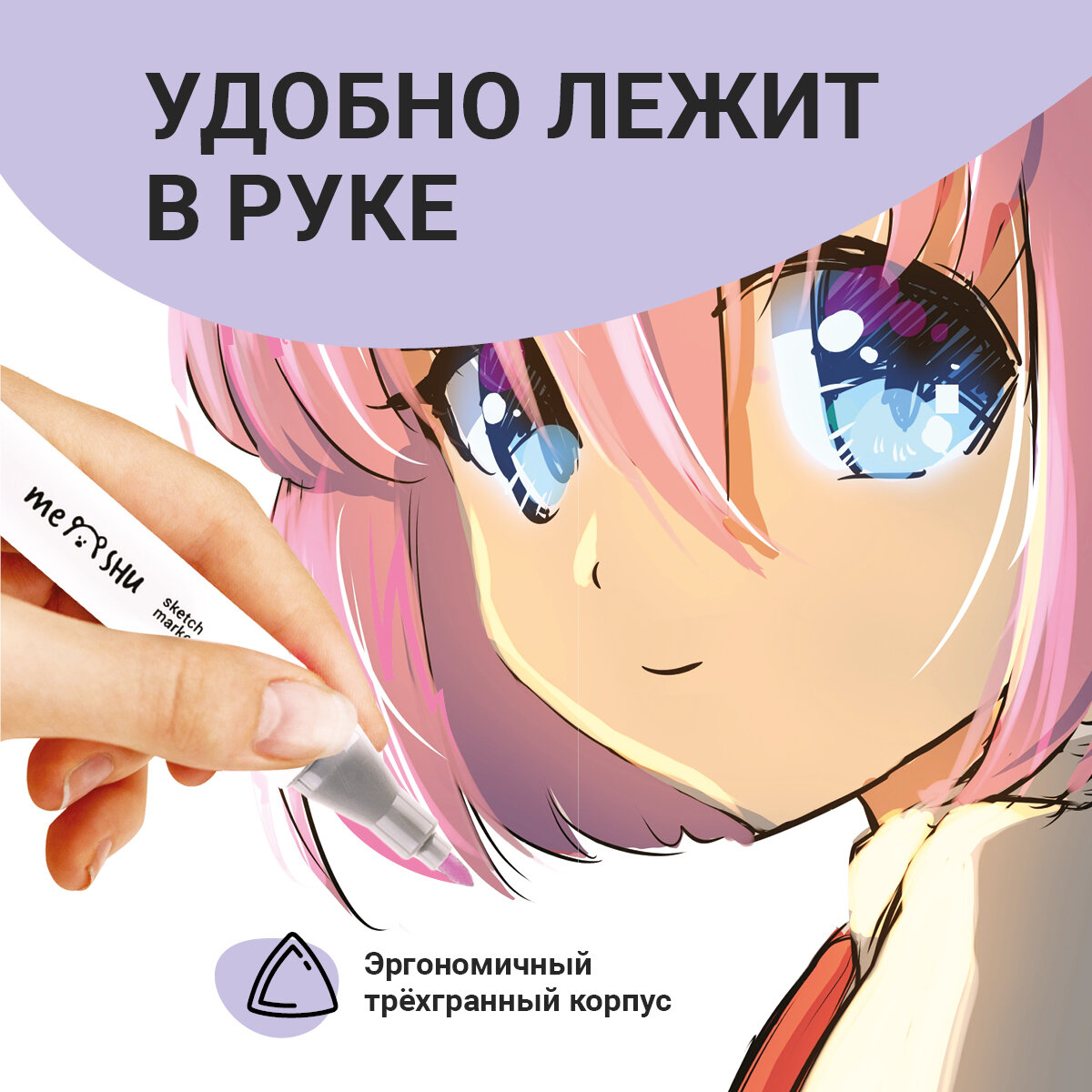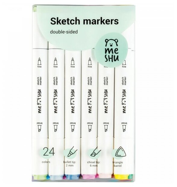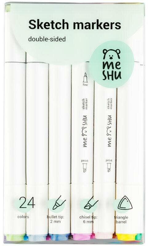 Набор двусторонних маркеров для скетчинга Meshu - идеальный выбор для художников, дизайнеров, иллюстраторов и любителей скетчинга, подходят для создания анимэ и манги. Эргономичный трехгранный корпус удобно лежит в руке и позволяет эффективно прорабатывать мелкие детали рисунка. Чернила на спиртовой основе - быстро высыхают, водостойкие, нетоксичны и не портят поверхность бумаги. Маркеры обладают пулевидным (2 мм) и скошенным (6 мм) наконечниками, толщина линии 1.0-7.0 мм, что позволяет прорабатывать как мелкие детали рисунка. так и закрашивать большие области.