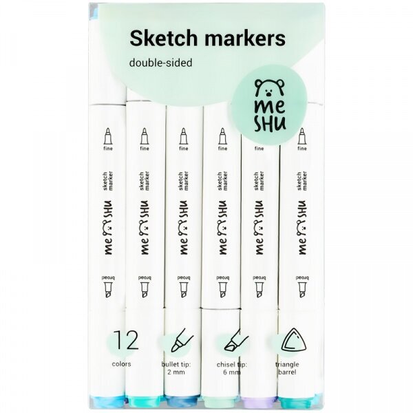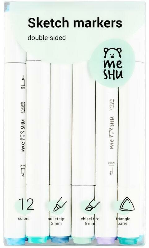 Набор двусторонних маркеров для скетчинга Meshu - идеальный выбор для художников, дизайнеров, иллюстраторов и любителей скетчинга, подходят для создания анимэ и манги. Эргономичный трехгранный корпус удобно лежит в руке и позволяет эффективно прорабатывать мелкие детали рисунка. Чернила на спиртовой основе - быстро высыхают, водостойкие, нетоксичны и не портят поверхность бумаги. Маркеры обладают пулевидным (2 мм) и скошенным (6 мм) наконечниками, толщина линии 1.0-7.0 мм, что позволяет прорабатывать как мелкие детали рисунка. так и закрашивать большие области.