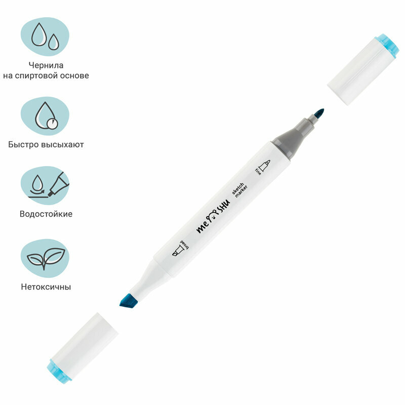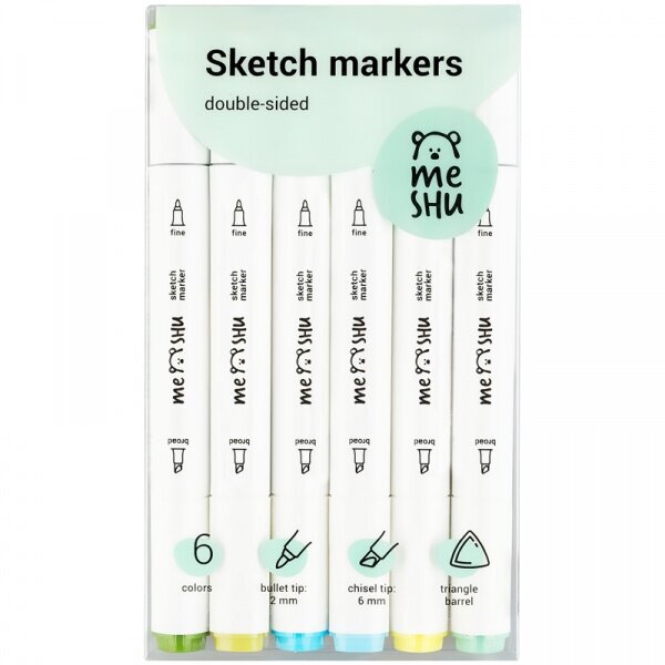 Набор двусторонних маркеров для скетчинга Meshu - идеальный выбор для художников, дизайнеров, иллюстраторов и любителей скетчинга, подходят для создания анимэ и манги. Эргономичный трехгранный корпус удобно лежит в руке и позволяет эффективно прорабатывать мелкие детали рисунка. Чернила на спиртовой основе - быстро высыхают, водостойкие, нетоксичны и не портят поверхность бумаги. Маркеры обладают пулевидным (2 мм) и скошенным (6 мм) наконечниками, толщина линии 1.0-7.0 мм, что позволяет прорабатывать как мелкие детали рисунка. так и закрашивать большие области.