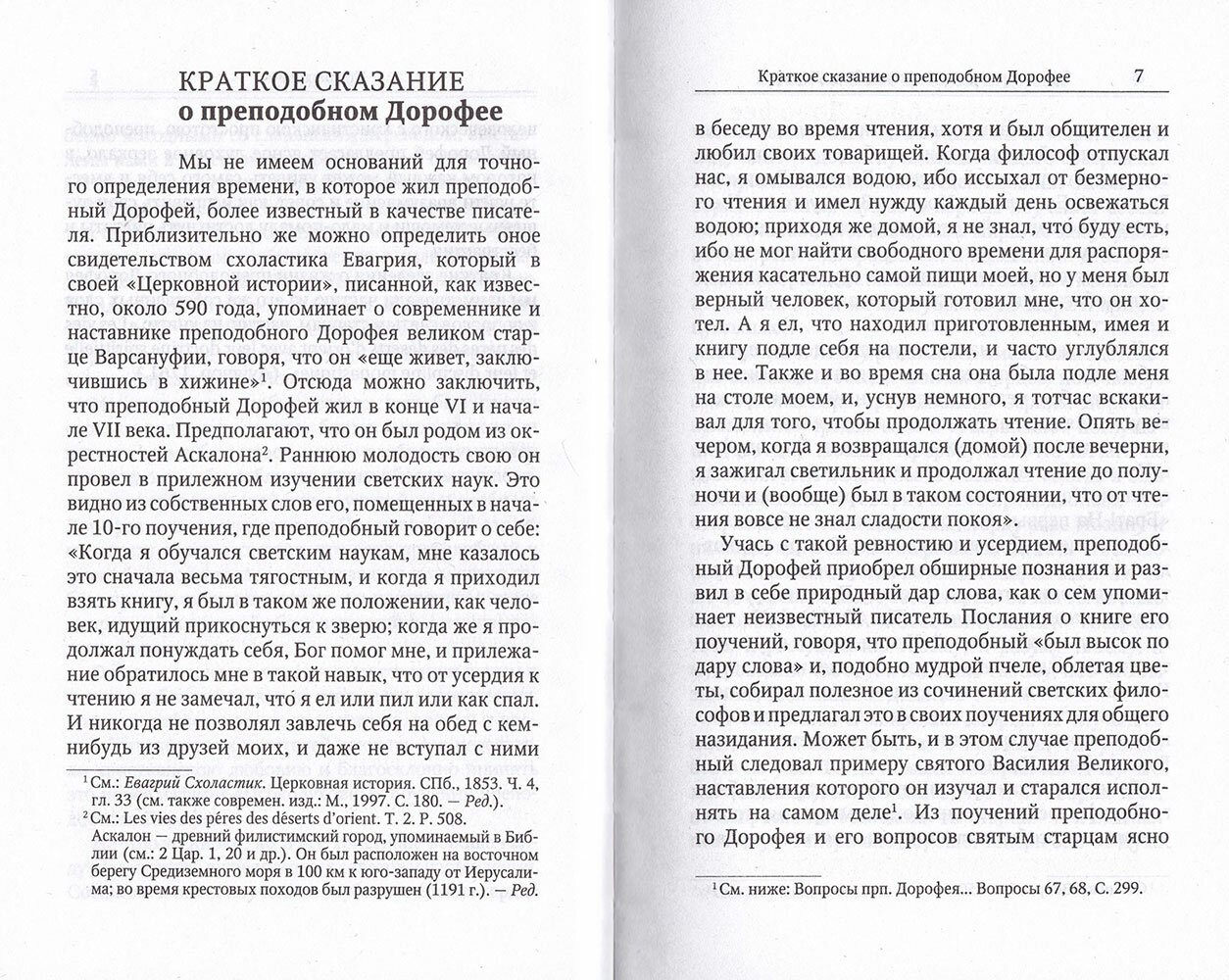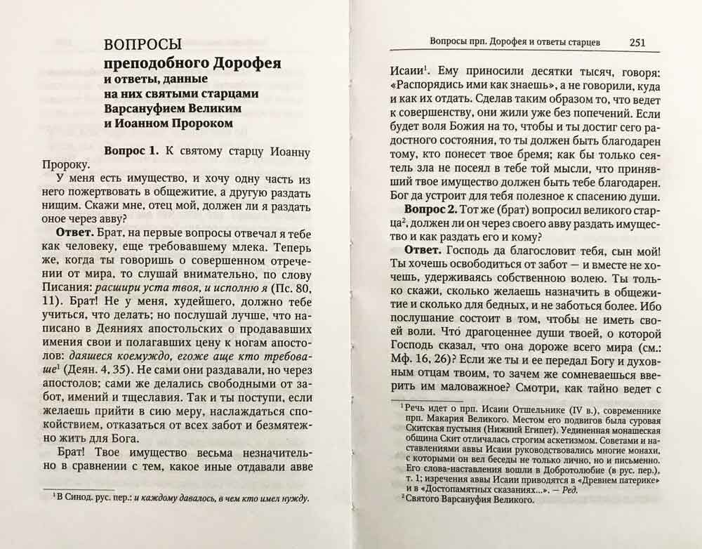 В основу знаменитой книги преподобного Дорофея (VI век; память 5/18 июня) легли его наставления своим ученикам. Авва Дорофей начал свой иноческий подвиг в обители прп. Серида (Палестина, близ Газы), где он окормлялся у великих старцев Варсонофия, Иоанна Пророка и аввы Серида. После кончины двух последних и ухода в полный затвор прп. Варсонофия, он принял настоятельство в одном из палестинских монастырей.