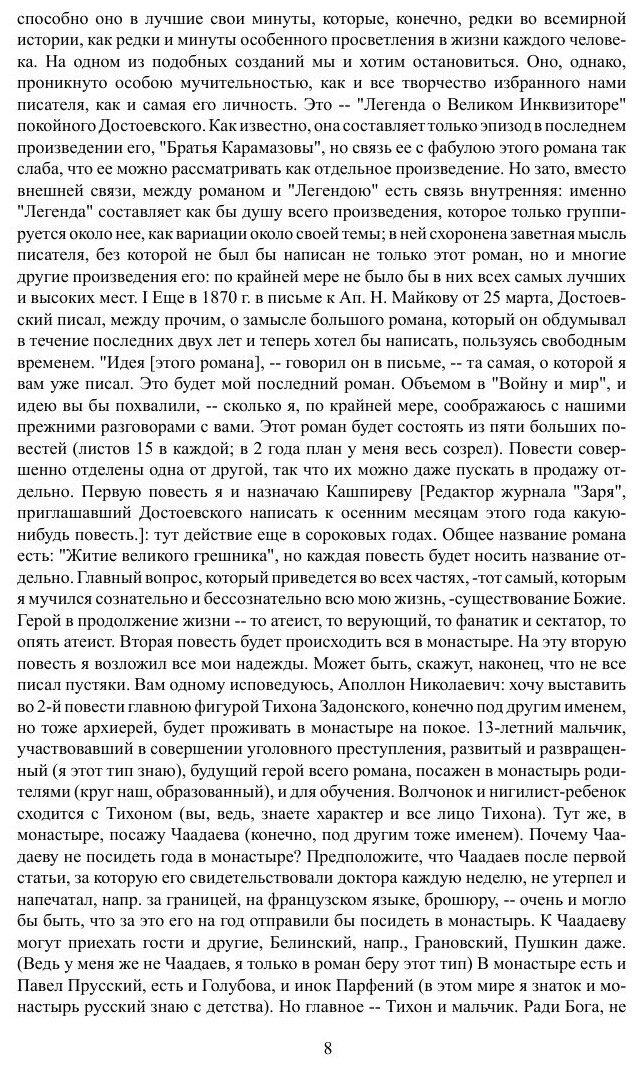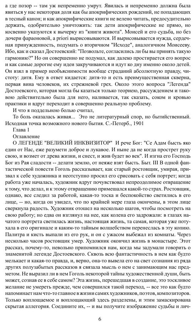 Опыт критического комментария, с приложением двух этюдов о Гоголе. "Читатель да не посетует, что главный труд, здесь предлагаемый и который он мог бы, судя по заглавию книги, ожидать один встретить в ней, сопровождается двумя небольшими критическими этюдами о Гоголе. Они вызваны были многочисленными возражениями, какие встретил в нашей литературе взгляд на этого писателя, мною побочно выраженный в "Легенде об Инквизиторе". С этими возражениями я согласиться не мог, и два небольших очерка, написанные мною в объяснение своего взгляда, помогут и читателю стать в этом спорном вопросе на ту или другую сторону. Главный же очерк, комментарий к знаменитой "Легенде" Достоевского, сопровождается впервые здесь приложениями, которые, как ключ, введут читателя в круг господствующих идей нашего покойного писателя и дадут также возможность отнестись критически к моим объяснениям его творчества." - предисловие к первому изданию.