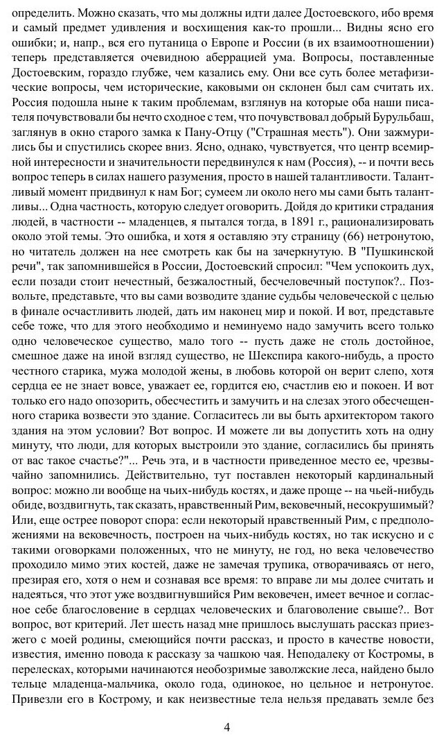 Замечательная работа одного из самых противоречивых мыслителей русской философии. «Провокатор духовной смуты Серебряного века» - как назвал его один из исследователей. Хотя, впрочем, эта работа в целом выдержана в «традиционных канонах» философско-литературного исследования и посвящена также во многом знаменательному и где-то даже и «символическому» для всей «русской жизни» роману Достоевского. Всем настоятельно рекомендую!
