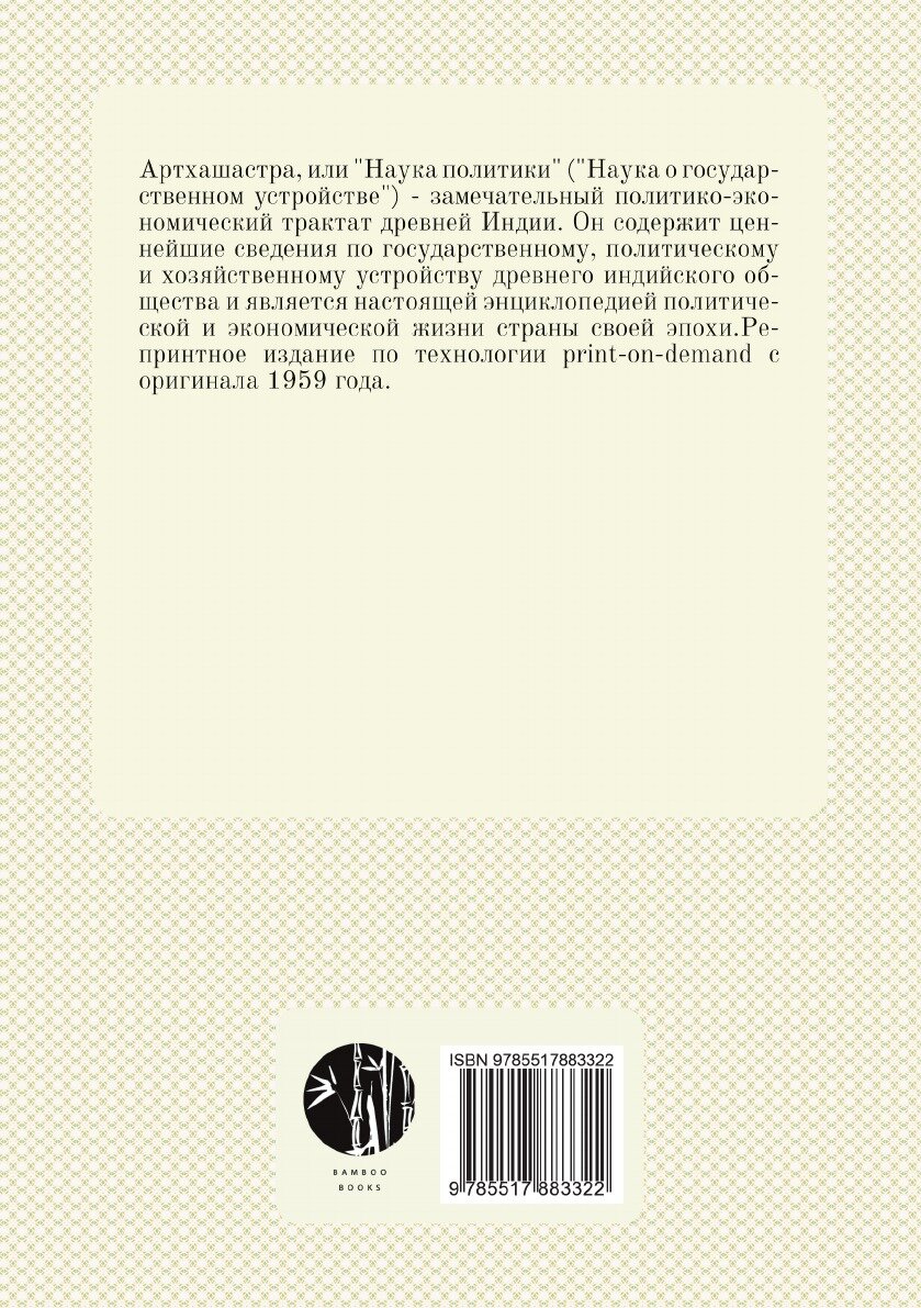 Артхашастра, или "Наука политики" ("Наука о государственном устройстве") - замечательный политико-экономический трактат древней Индии. Он содержит ценнейшие сведения по государственному, политическому и хозяйственному устройству древнего индийского общества и является настоящей энциклопедией политической и экономической жизни страны своей эпохи.Репринтное издание по технологии print-on-demand с оригинала 1959 года.