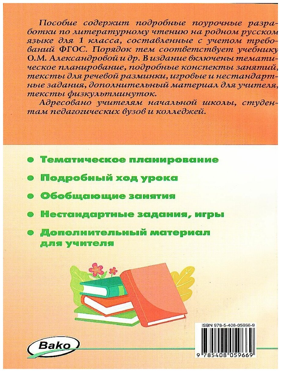 В пособии представлены поурочные разработки по литературному чтению на родном русском языке для 1 класса, составленные в соответствии с требованиями ФГОС. Порядок тем соответствует учебнику О.М. Александровой и др. (М.: Просвещение), входящему в действующий федеральный перечень учебников. Помимо подробного плана работы над произведениями, включёнными в программу, сценарий каждого урока содержит тексты для речевой разминки, физкультминутки, игровые и нестандартные задания, дополнительный материал для учителя.