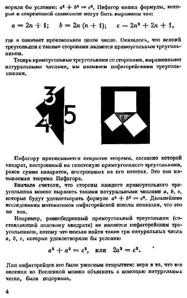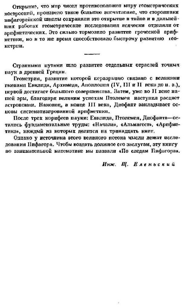 В книге собраны интереснейшие математические и геометрические задачи. И называется она "По следам Пифагора" в честь великого математика древней Греции. Вслед за ним были другие корифеи науки: Евклид, Птоломей, Диофанта, но у истоков исследования этих вопросов стоял Пифагор.