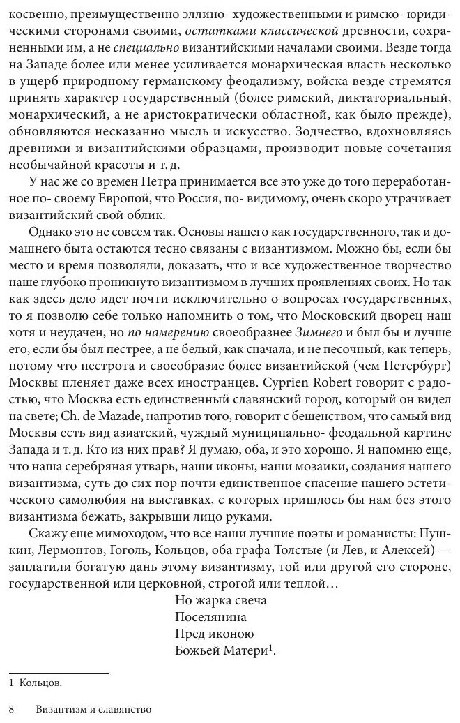 Книга-размышление некогда блестящего царского дипломата, проведшего долгие годы в Османской империи и на Балканах, а потом - писателя, консервативного философа и, наконец - отшельника, скончавшегося под именем "схимонах Климент", посвящена сложному вопросу: что важнее: религиозное единство или национальная идентичность? Вопрос этот стал наиболее актуальным после обретения Болгарией самостоятельности от Турции. Вместе с проблемой государственной независимости власти предприняли попытку достичь независимости и церковной, отделившись от Константинопольского патриархата и образовав так называемую "Болгарскую схизму" (урегулированную, кстати, только в середине 20 века). Так вот, именно над вопросами, кто прав, что важнее для России - поддерживать "братьев-славян по крови" или быть гарантом единства церкви, веры и наследниками Византийской империи, и рассуждает Константин Николаевич Леонтьев.