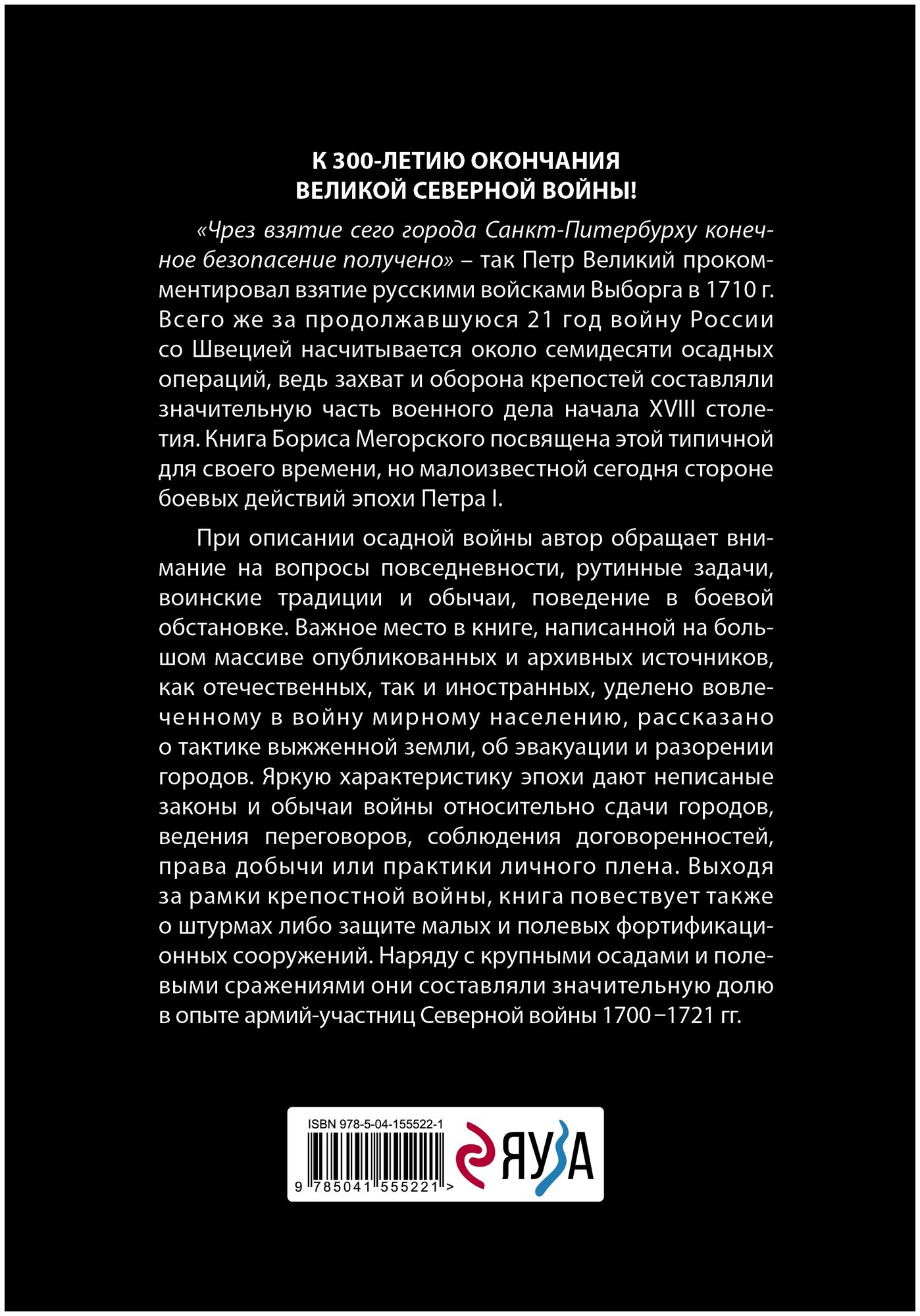 "Чрез взятие сего города Санкт-Питербурху конечное безопасение получено" - так Петр Великий прокомментировал взятие русскими войсками Выборга в 1710 г. Всего же за продолжавшуюся 21 год войну России со Швецией насчитывается около семидесяти осадных операций, ведь захват и оборона крепостей составляли значительную часть военного дела начала XVIII столетия. Книга Бориса Мегорского посвящена этой типичной для своего времени, но малоизвестной сегодня стороне боевых действий эпохи Петра I.