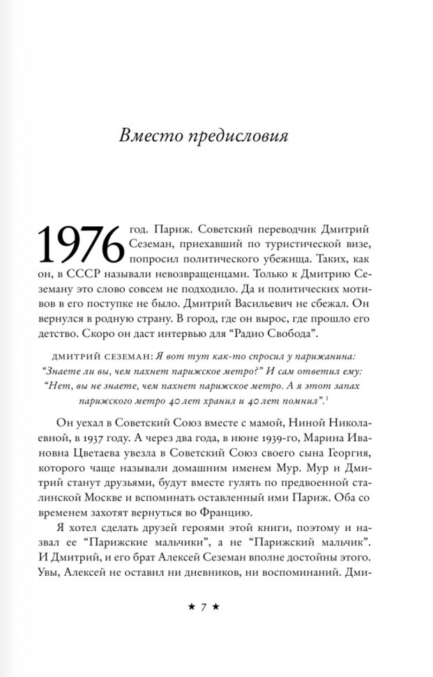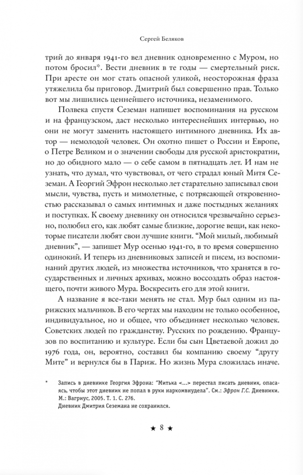 Книга Белякова не исключение, хотя посвящена в первую очередь Муру, таково было домашнее прозвище сына Цветаевой и Эфрона, под этим именем он вошел в историю русской литературы двадцатого века. Дмитрий Сеземан, второй парижский мальчик, о котором рассказывает книга, выглядит в сравнении с ним более, чем скромно, и не потому, что первый был сыном звезды русской литературы, а второй, хотя и внук академика принадлежал к числу людей куда мере публичных.
