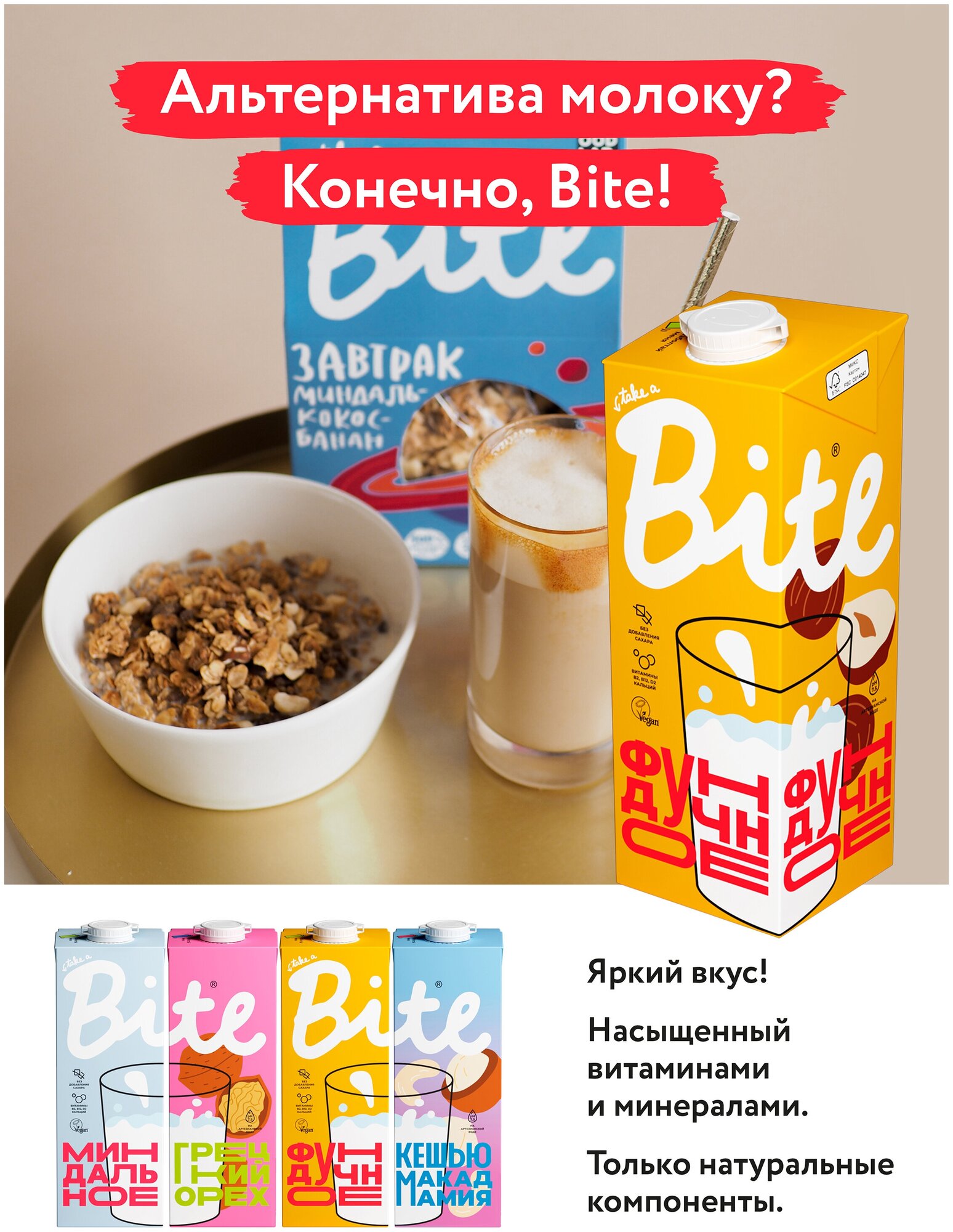 Заявляем официально: мы буквально снимаем ореховое молоко с куста! Собираем отборный фундук, добавляем чистеи?шую артезианскую воду и получаем насыщенныи? напиток. При этом в таком напитке нет животных жиров, зато есть кальции? и витамины группы B и D2. Вся сила и ценность лесного ореха в одном стакане! Молоко Bite сертифицировано British Vegan Society, поэтому подходит даже веганам.