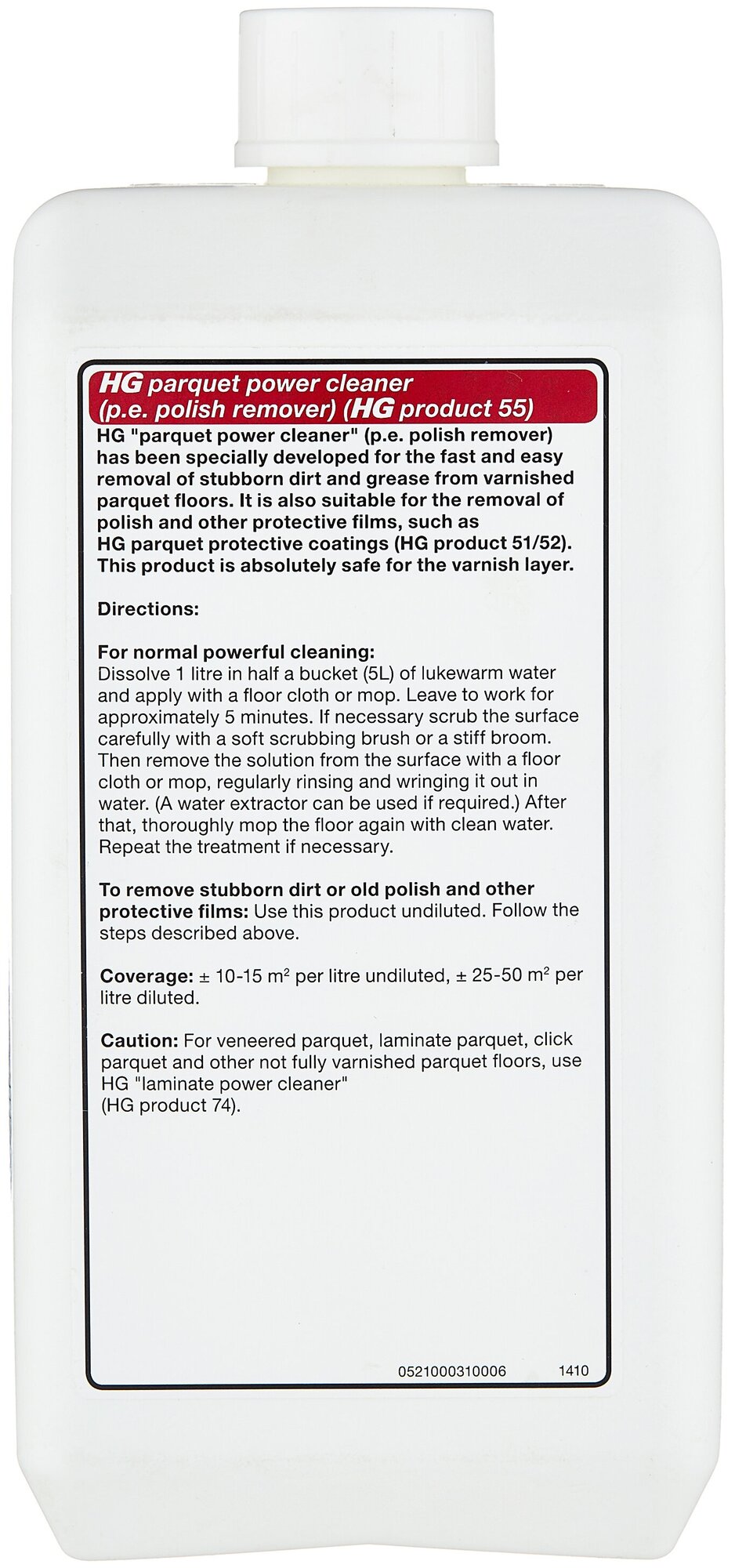 Применение: Для удаления старых слоев полироля используйте средство концентрированным. Для очистки пола разведите средство с водой в пропорции 1:5 (1 часть средства, 5 частей воды). Обильно нанесите средство на пол. Оставьте действовать на несколько минут. Затем потрите пол, регулярно прополаскивая салфетку для мытья пола. Тщательно помойте пол чистой водой, хорошо отжимая салфетку для мытья пола во избежание набухания пола. При необходимости повторите обработку. Перед нанесением нового слоя HG «Полироля для паркета» дайте полу высохнуть в течение 2 часов.