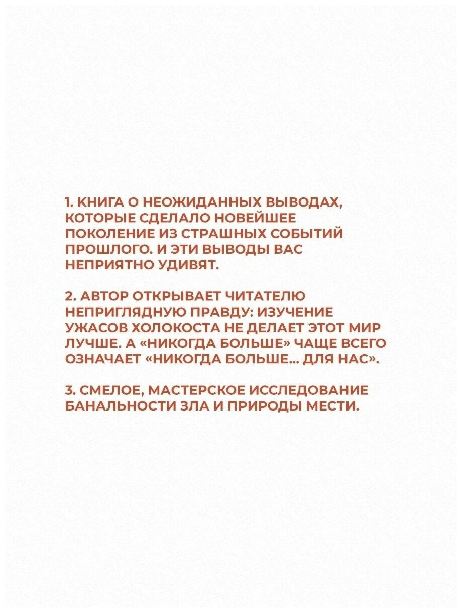 Автор открывает читателю неприятную правду, зачастую скрытую за слишком обнадеживающим восприятием человечества, и говорит о том, что изучение ужасов Холокоста не делает этот мир лучше. А "никогда больше" чаще всего означает "никогда больше… для нас".