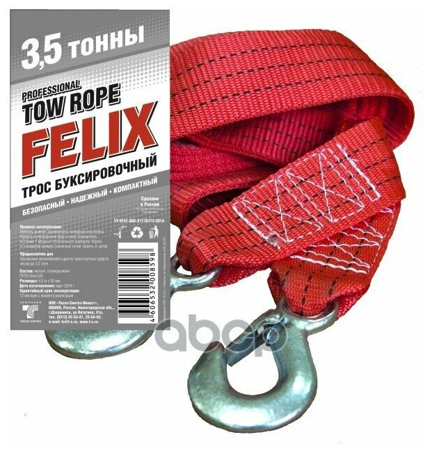 FELIX Трос буксировочный 3,5 тонн лента с 2 крюками "FELIX". FELIX Трос буксировочный 3,5 тонн лента с 2 крюками "FELIX".