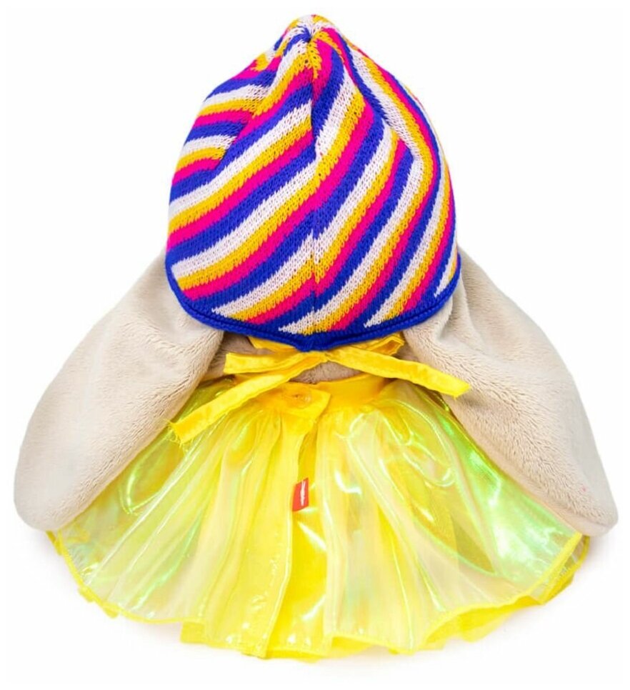 Зайка в пышном платье без рукавов. Платье цвета лимонада сшито из тканей компаньонов и украшено розовым бантиком. В комплекте — необычная вязаная шапочка, связанная диагональными яркими полосами из мягкого акрила. Шапочка украшена крупными блестящими пайетками.