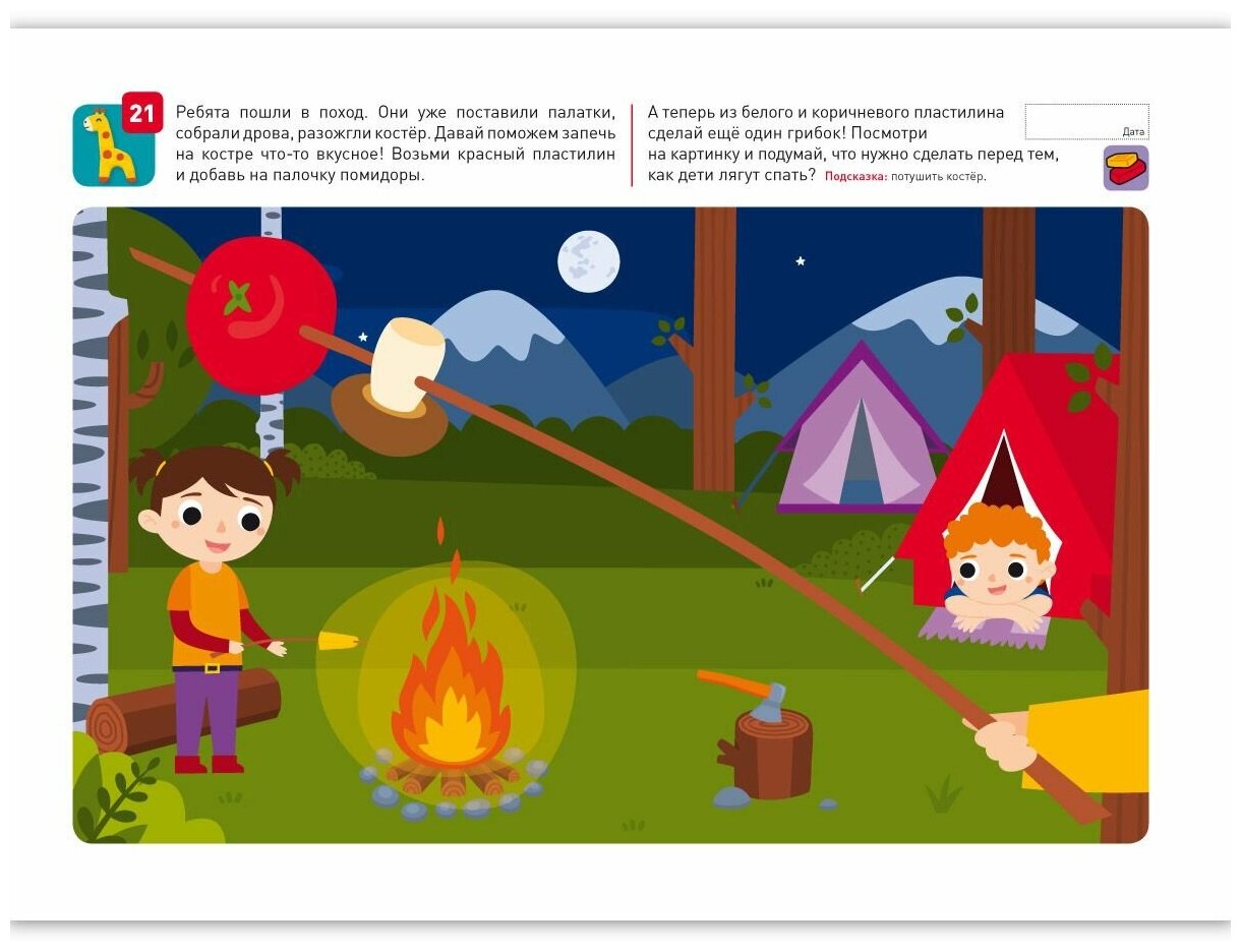 Ребёнок будет тренироваться растягивать пластилин по бумаге, научится лепить шарики и палочки, а ещё попробует вылепить более сложные поделки, например рога оленя, щит и меч.