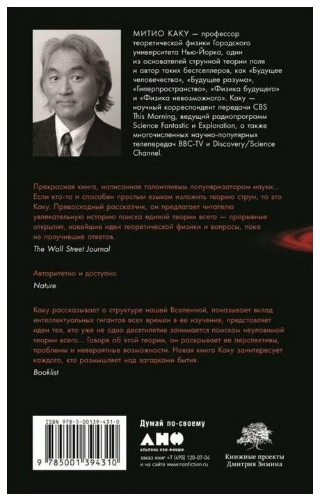 «Уравнение Бога» — это увлекательный рассказ о поиске самой главной физической теории, способной объяснить рождение Вселенной, ее судьбу и наше место в ней. Знаменитый физик и популяризатор науки Митио Каку прослеживает весь путь удивительных открытий — от Ньютоновой революции и основ теории электромагнетизма, заложенных Фарадеем и Максвеллом, до теории относительности Эйнштейна, квантовой механики и современной теории струн, — ведущий к той великой теории, которая могла бы объединить все физические взаимодействия и дать полную картину мира. Уже более полувека физики разных стран не могут достичь этой грандиозной цели. Правильный ли путь они избрали? Есть ли «свет в конце тоннеля»? Об этом — новая книга Митио Каку.