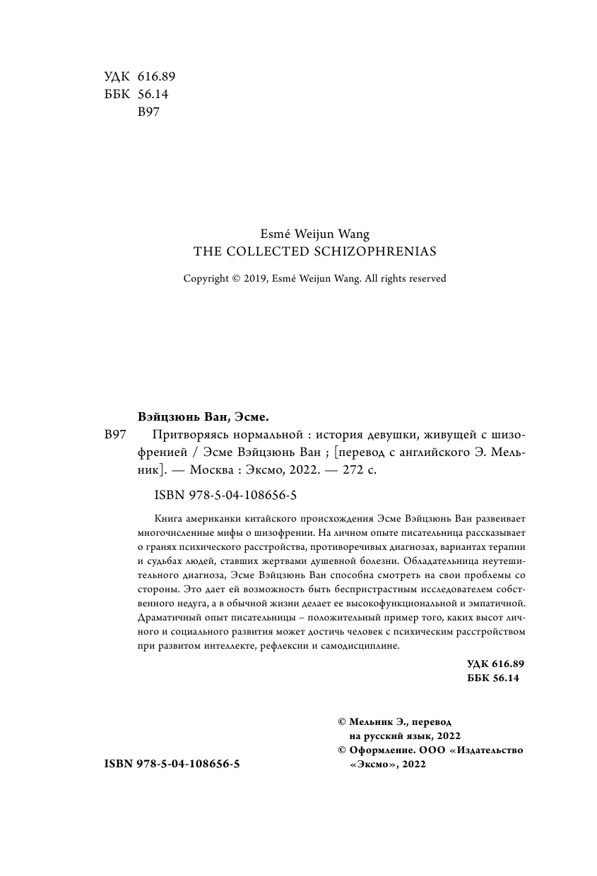Притворяясь нормальной. История девушки живущей с шизофренией (Вэйцзюнь Эсме Ван); ООО "Издательство "Эксмо", 2022