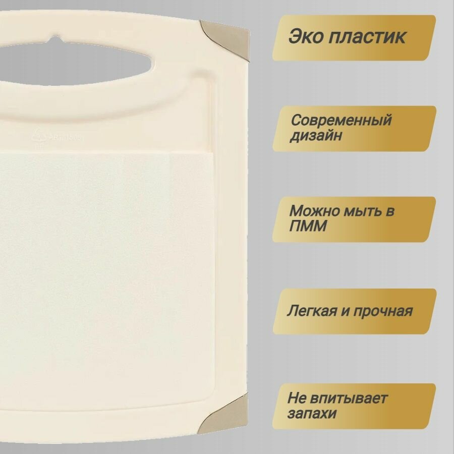 Разделочная доска может применяться для различных видов продуктов. Каждая доска снабжена желобком для стока жидкости для удобства применения. Доска не впитывает запахи, устойчива к воздействию ножом, благодаря чему изделие более долговечно. На кухне рекомендовано иметь несколько досок для различных видов продуктов: мяса, рыбы, хлеба и овощей.