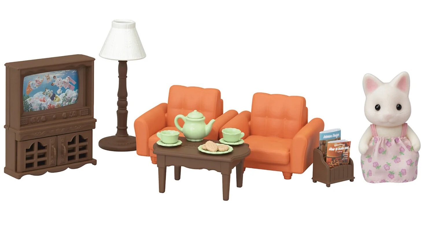 В наборе Sylvanian Families «Гостиная» есть все, что нужно, чтобы создать красивую и уютную гостиную в домике. Также в нем есть фигурка дочки котенка из семьи Цветочных котов. Она готова принимать гостей! Может усадить их в кресла, напоить чаем, предложить посмотреть интересную передачу по телевизору. Набор дает ребенку возможность воспроизводить повседневную жизнь. • Комплект сочетается с другими наборами Sylvanian Families. • Игрушка стимулирует воображение ребенка, помогает ему переносить личный опыт в сюжетно-ролевые сценки.
