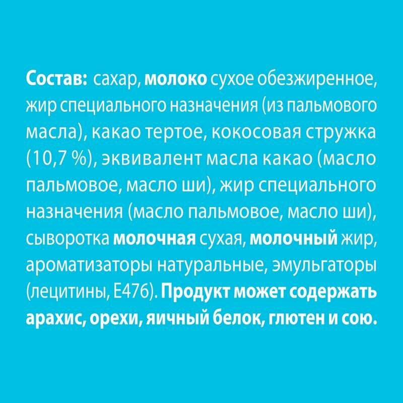 | Состав | сахар, сухое цельное молоко, масло растительное, кокосовая стружка (11 %), какао тертое (10,6 %), эквивалент масла какао (масла пальмовое, ши), сыворотка молочная сухая, молочный жир, натуральные ароматизаторы (кокос, ваниль), эмульгаторы (соевый лецитин, е476) |