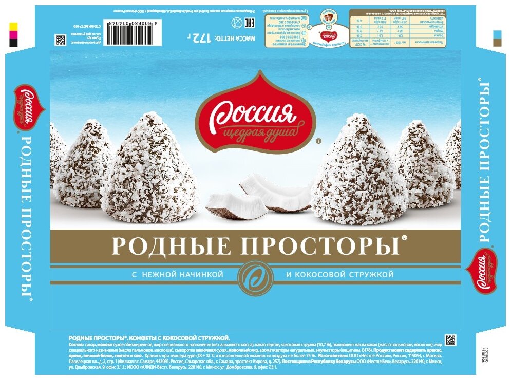 Конфеты Россия "Родные просторы" с нежной начинкой и кокосовой стружкой 172гр (12453222)