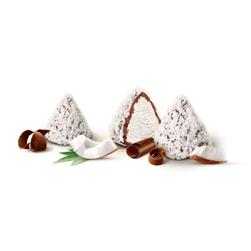 Конфеты с нежной начинкой со вкусом кокоса, покрытые глазурью и кокосовой стружкой.