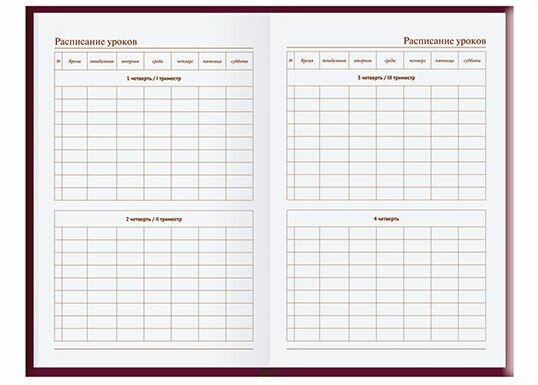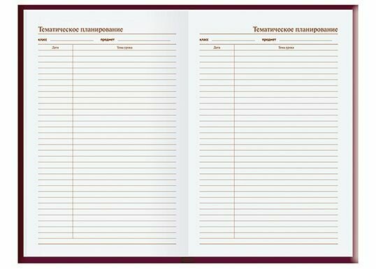 Информационно-справочный блок включает календарь на 4 года, документацию для учителя, таблицы по внеклассной и методической работе, страницы с почасовым планированием дня, классный журнал, тематическое планирование, успеваемость. На страницах ежедневника проставлены число и месяц, но нет привязки ко дню недели и году.