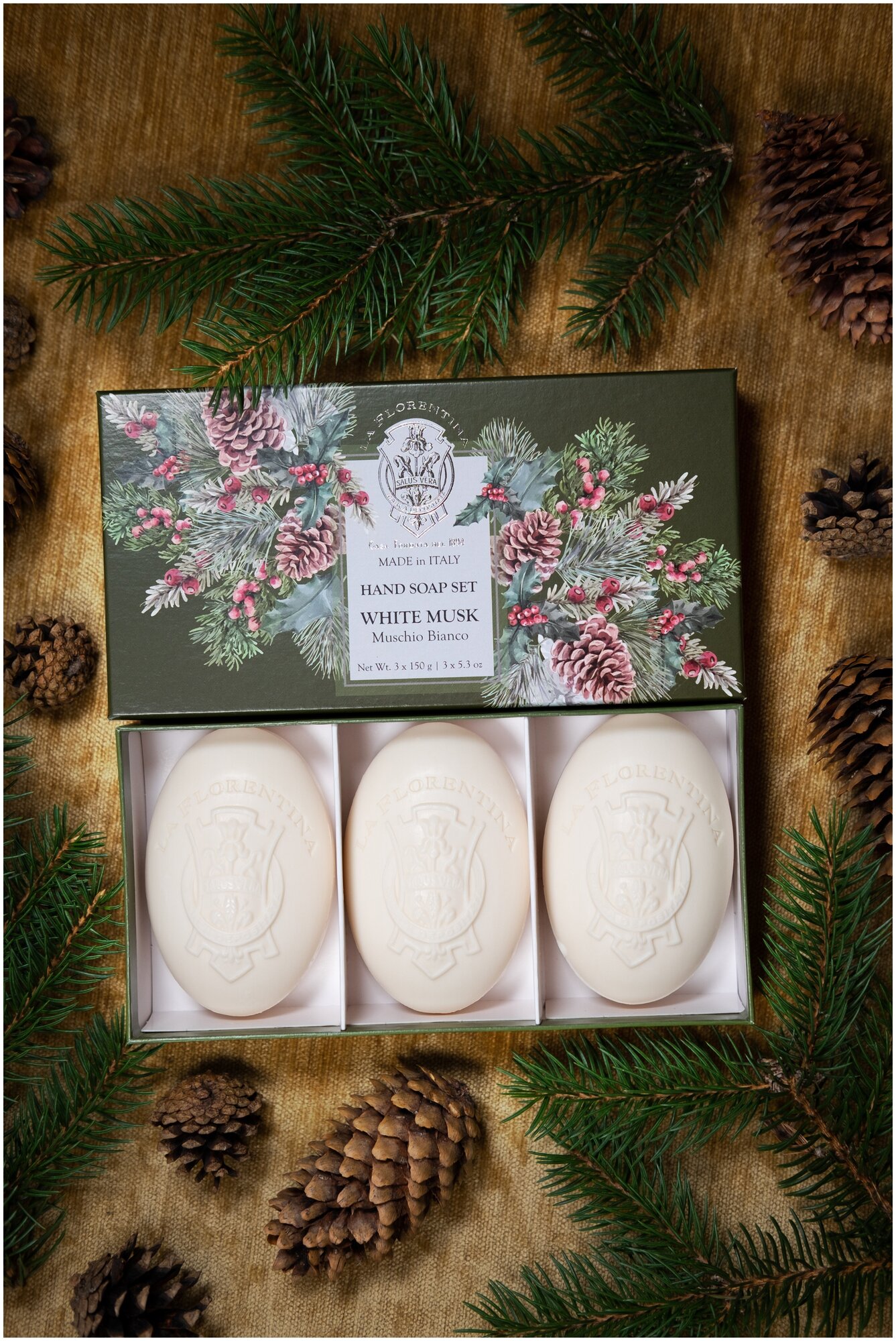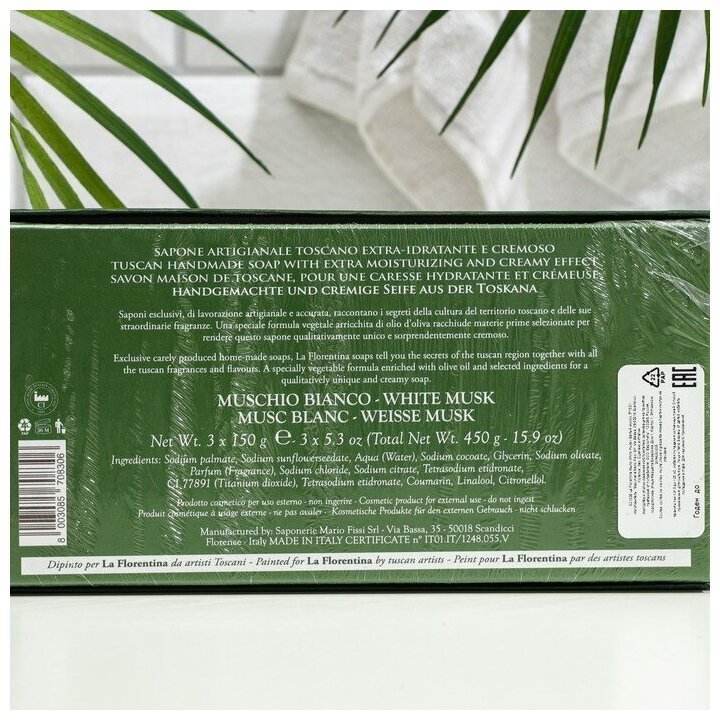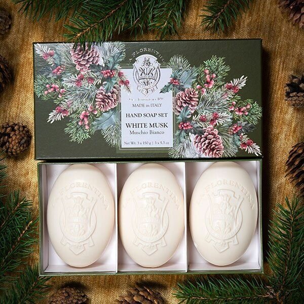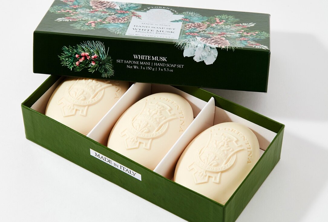 В шумном и быстром современном мире, переполненном запахами, звуками и событиями, нам больше всего не хватает чистоты, свежести и спокойствия. Итальянский бренд La Florentina, внимательно прислушивающийся к желаниям своих покупателей, сумел создать особенный продукт, аромат которого подарит вам все, чего не достает в повседневной жизни. Подарочный набор мыла «Белый мускус» это не только непревзойдённое качество и сказочно красивая праздничная упаковка, но и нежнейший изысканный аромат морозного утра в сосновом лесу, который очарует даже самого притязательного ценителя мускусных ароматов.