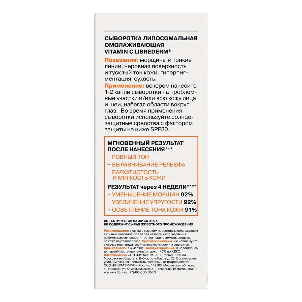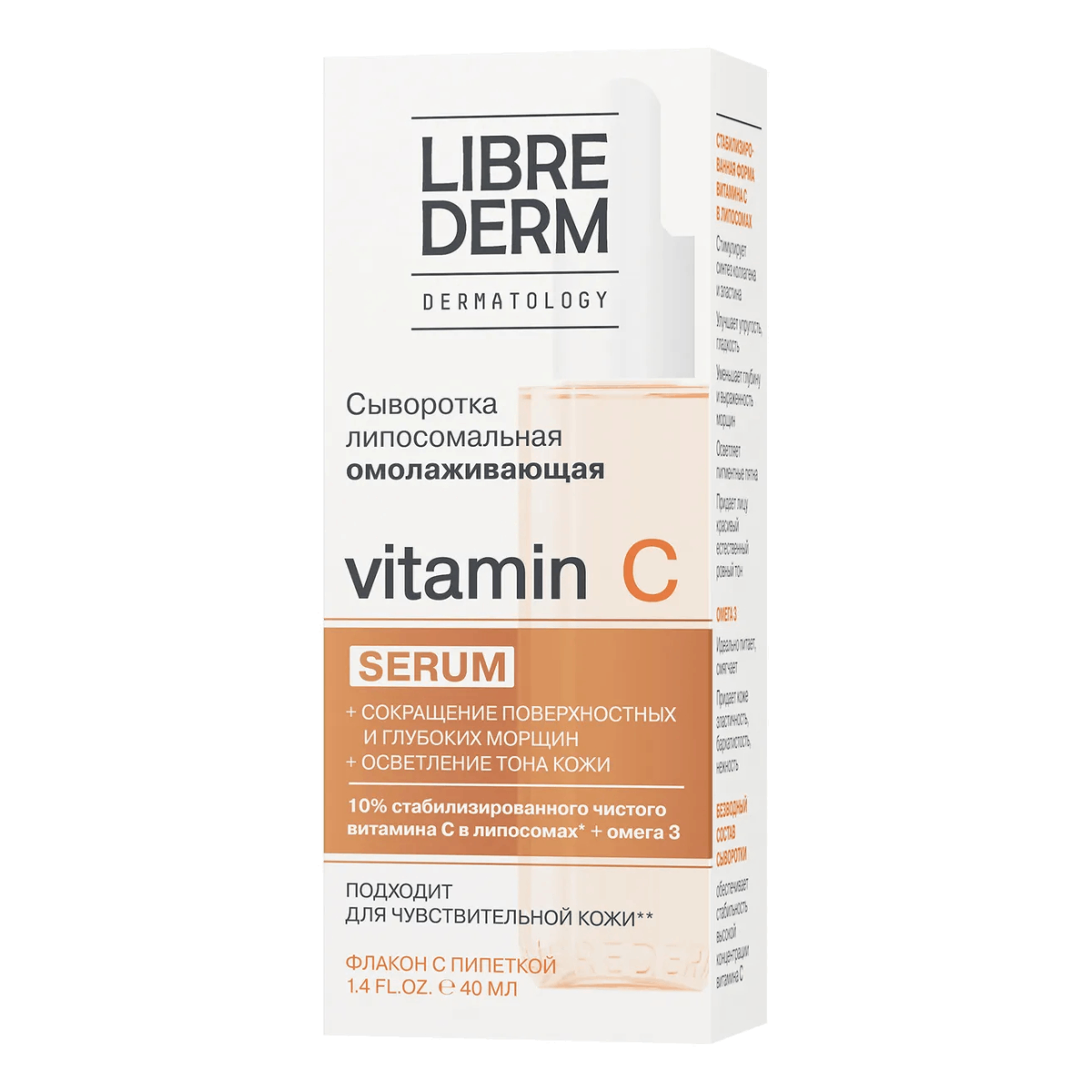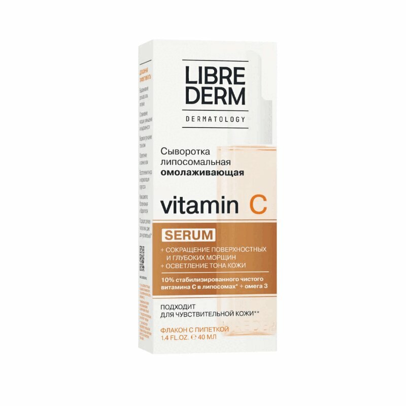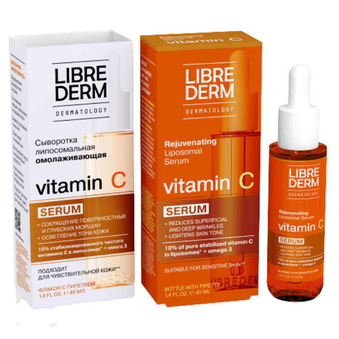 LIBREDERM сыворотка липосомальная омолаживающая Vitamin C В состав сыворотки «Vitamin C» входит: - Инновационная стабилизированная форма витамина С в высокой концентрацией, которая стимулирует синтез коллагена и эластина, улучшает упругость, гладкость, уменьшает глубину и выраженность морщин, осветляет пигментные пятна, придает лицу красивый естественный тон.выраженность морщин, осветляет пигментные пятна, придает лицу красивый естественный тон, бархатистость и нежность.