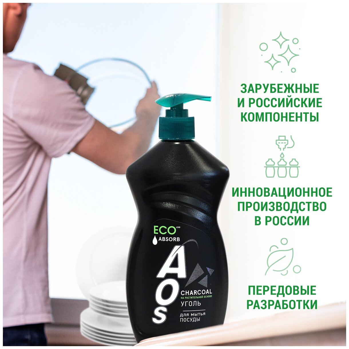 AOS ЭКО - новое поколение средств для мытья посуды, созданных с заботой о человеке и об окружающей среде: биоразлагаемый состав, ингредиенты на основе растительных тропических масел, природные добавки и перерабатываемая упаковка.