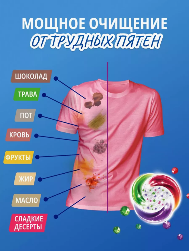 | Меры предосторожности | Использовать строго по назначению! Не разрывайте оболочку капсулы, прежде чем закинуть ее в барабан! Специальная водорастворимая оболочка растворится сама. Беречь от детей. |