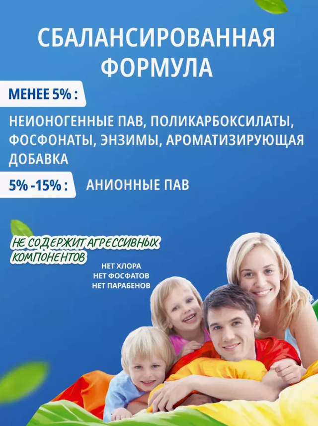 | Химический состав | 30% и более: анионные ПАВ; 15% или более, но менее 30%: неионогенные ПАВ; 5% или более, но менее 15% |