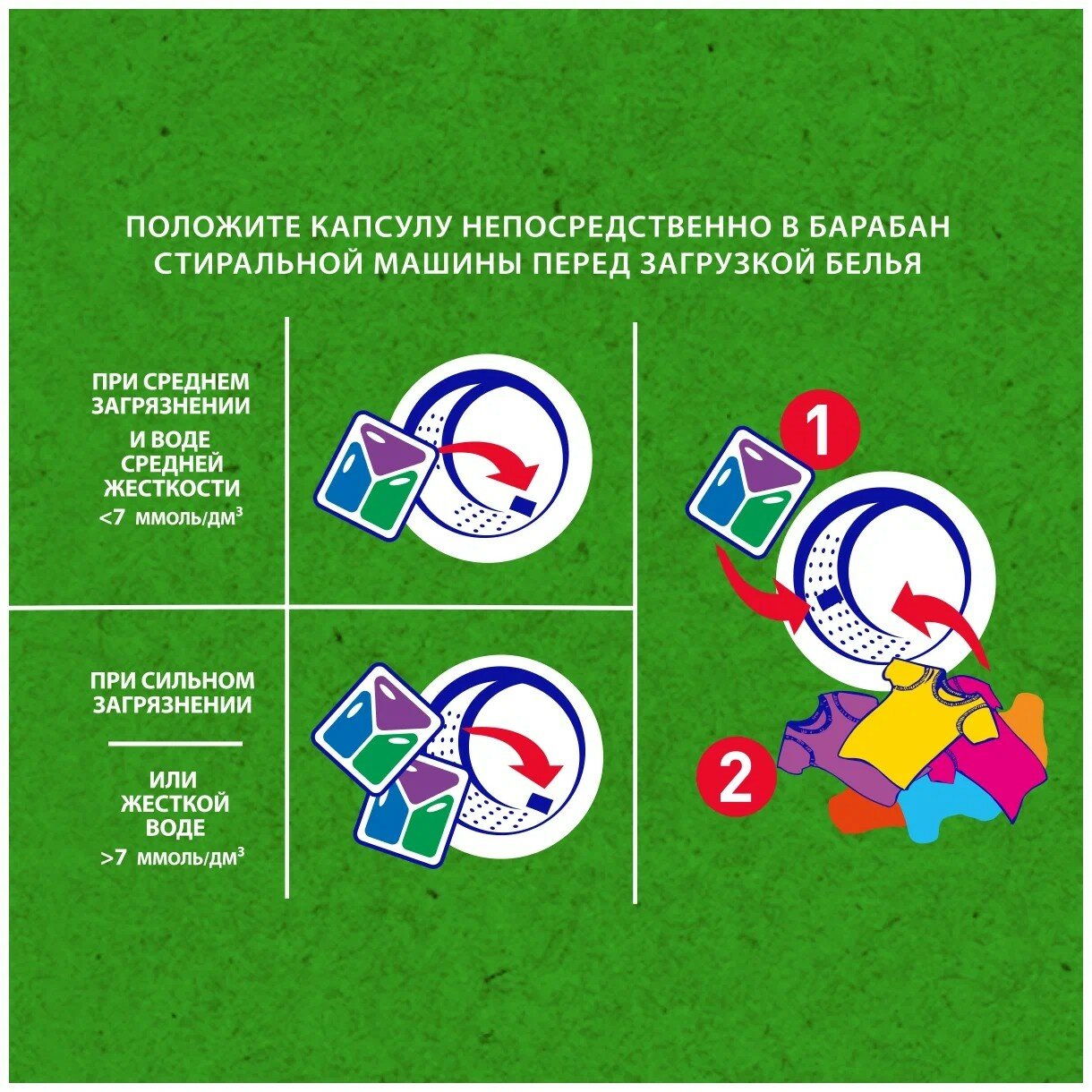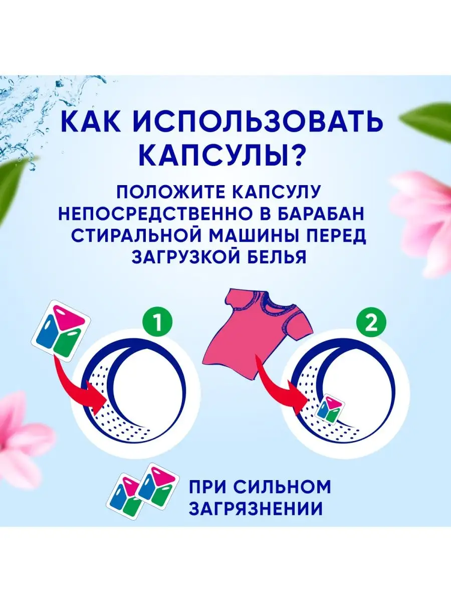 | Способ применения | Достаньте капсулу из упаковки и положите ее на дно барабана для того, чтобы вода как можно быстрее ее растворила. Поверх капсулы загрузите в барабан стиральной машины загрязненное сухое белье. При необходимости добавьте ополаскиватель в специальный отсек стиральной машины. Включите стиральную машину и запустите стирку. |
